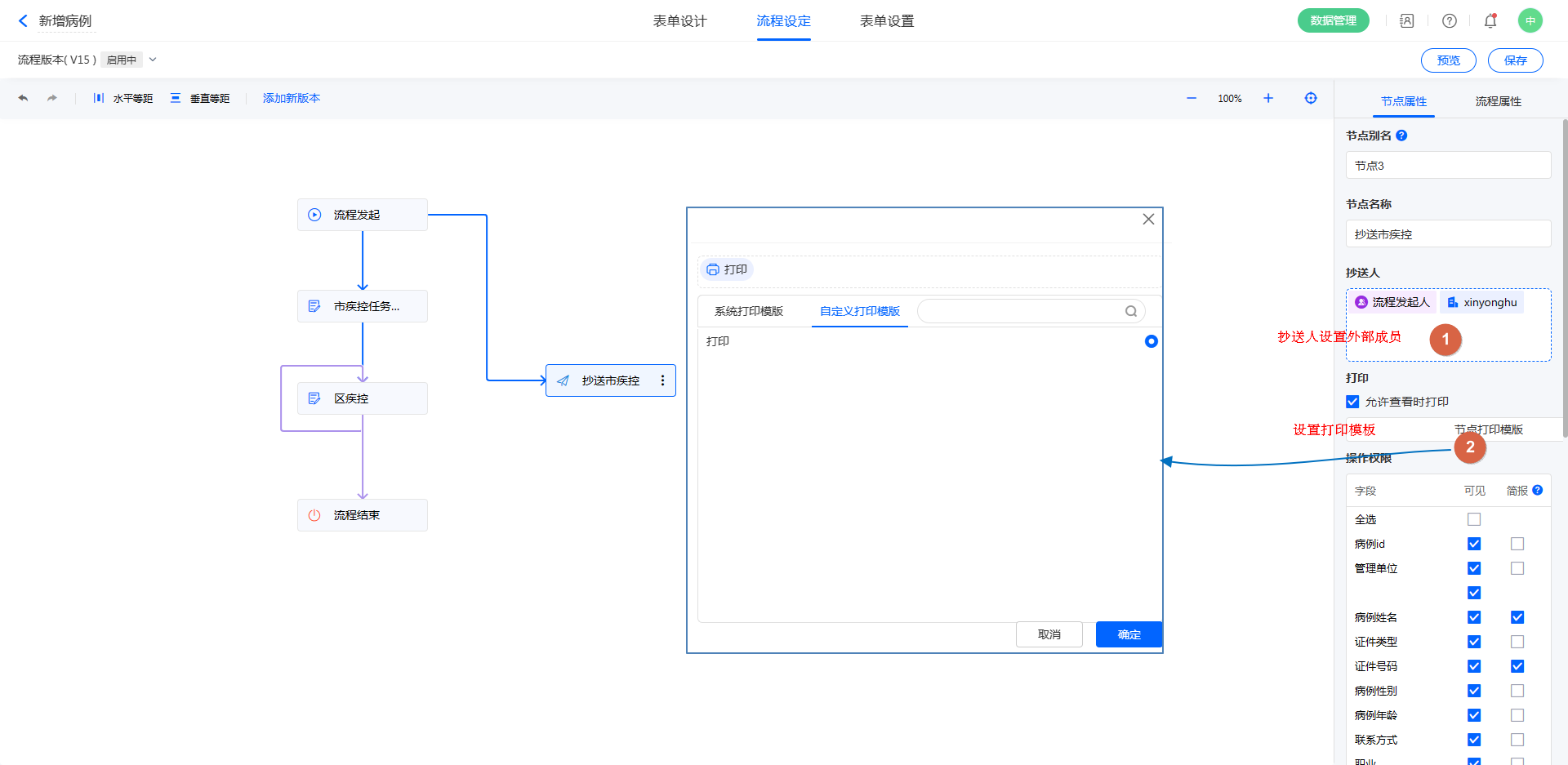 第一步:进入流程设计页面,选择一个抄送节点,勾选允许查看时打印,并配置打印模板。