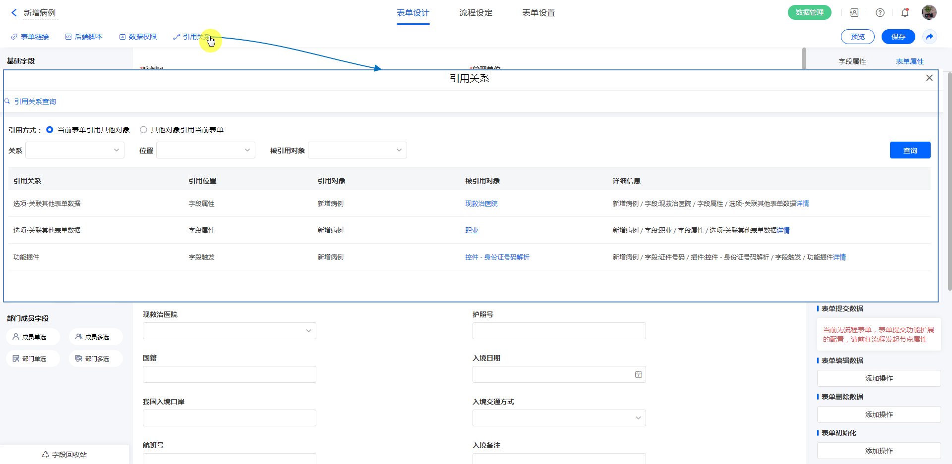 • 其他对象引用当前表单:当前表单被其他表单、聚合表、数据视图、报表等引用。