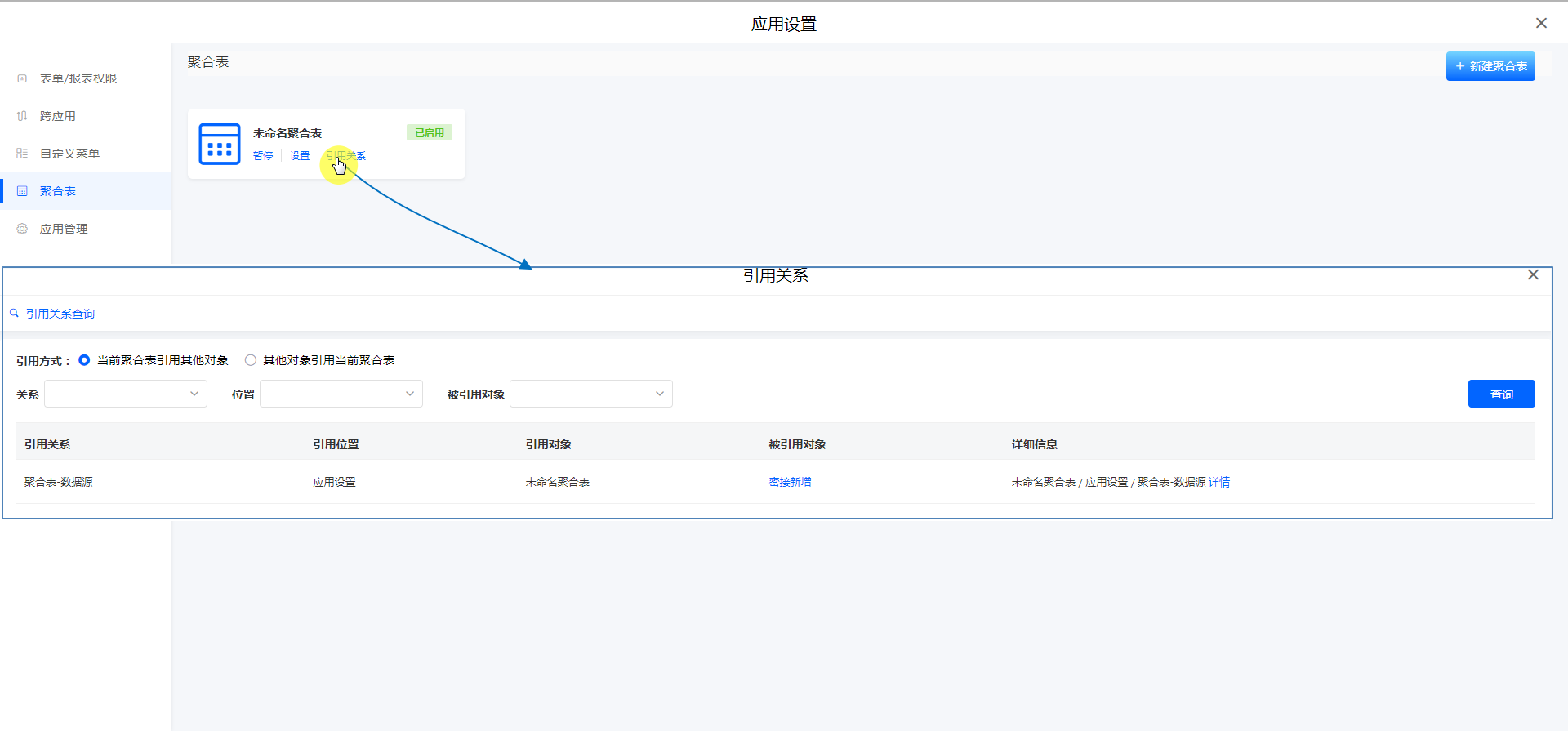 • 应用设置>>聚合表>>引用关系