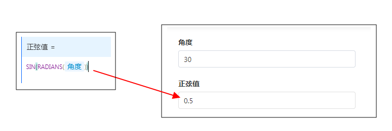 如计算 SIN(30°) 的值,可设置公式为SIN(RADIANS(30)),返回 0.5。