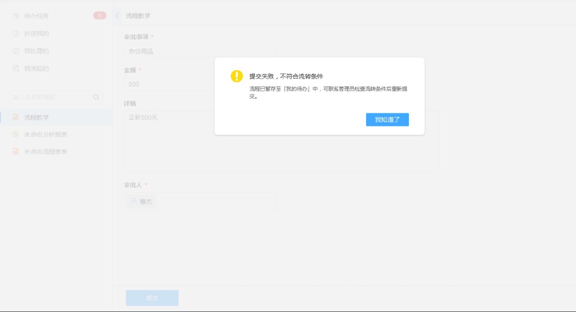 按照刚才的条件流转设定,我们忽略了金额=500的设定,也就意味着,当我们审批金额正好是500元的时候,会出现既不满足部门审批,又不满足人事部审批的情况,如图所示: