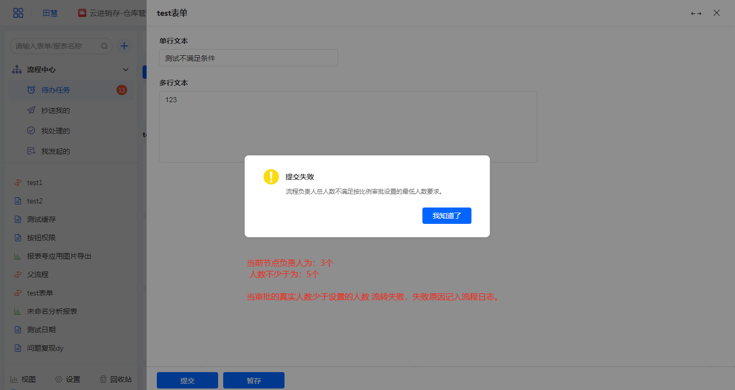 节点选择按比例后,会同时校验 人数 和 人数比例,当两则满足,进入下一个节点,不满足会停留在当前节点,等待下一个人审批。当审批的真实人数少于设置的人数时,流转失败,失败原因写入流程日志。