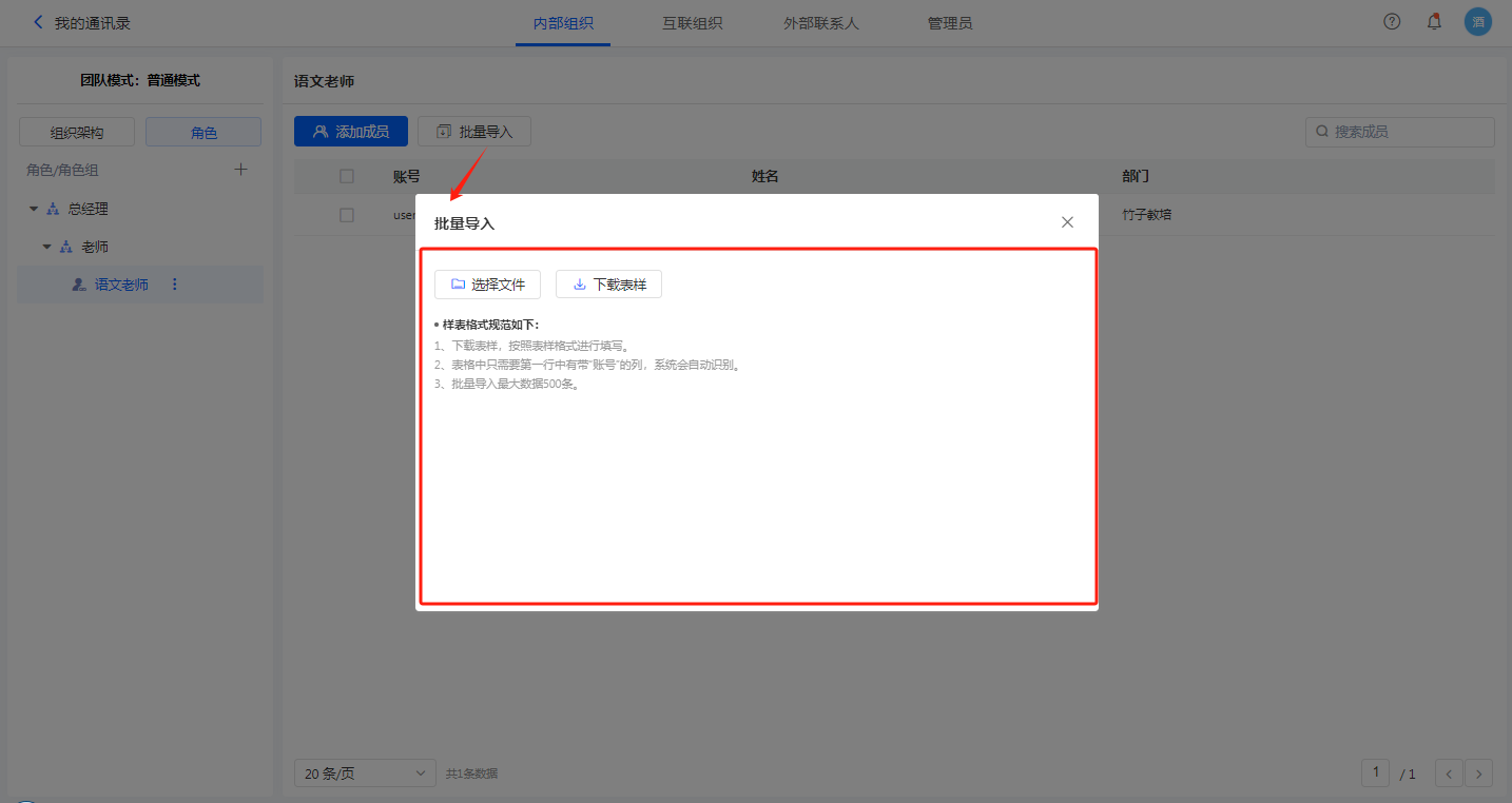 批量导入成员前需下载表样,按表样进行填写,填写完成后保存Excel文件,然后点击【选择文件】进行导入。