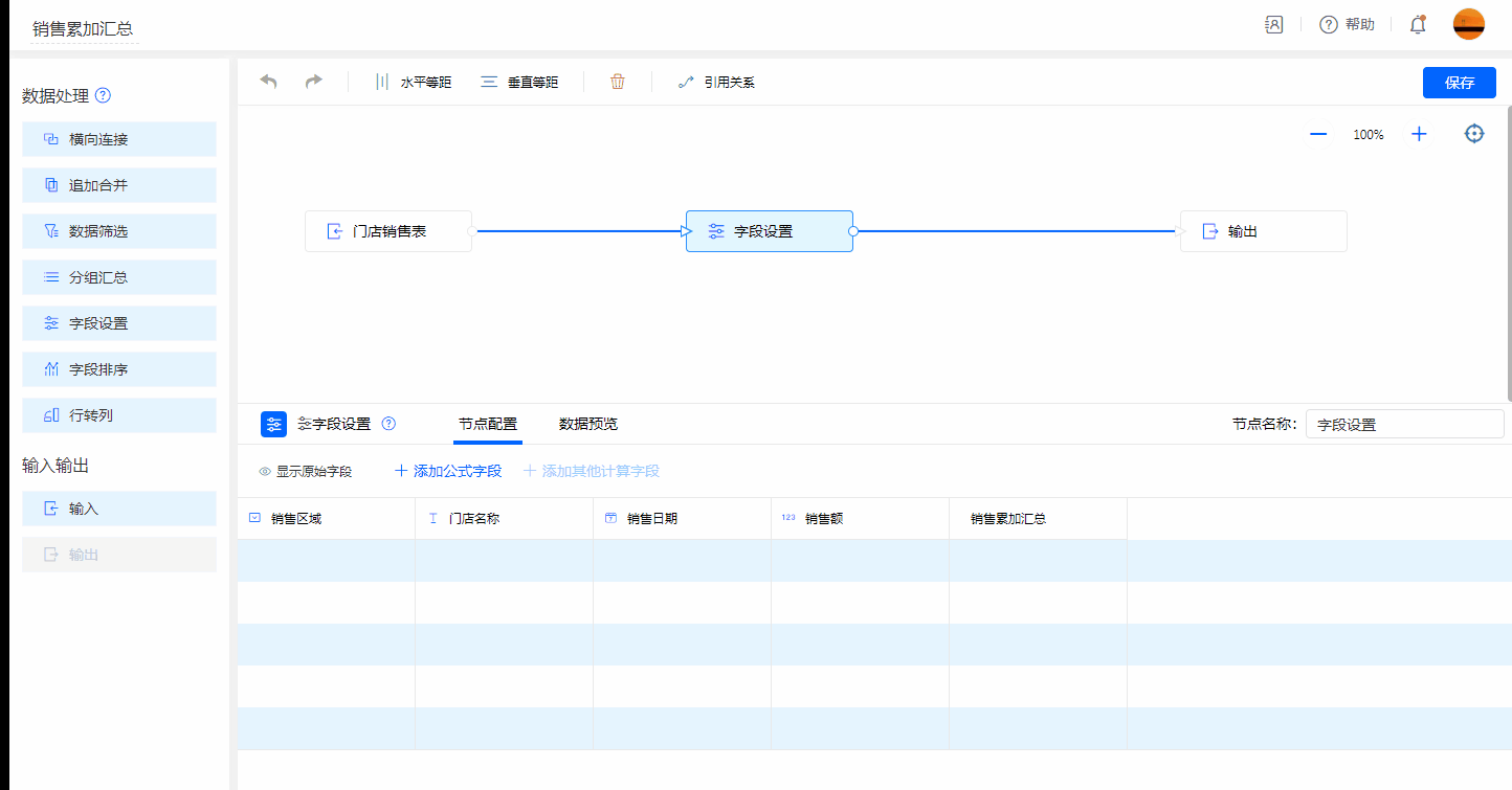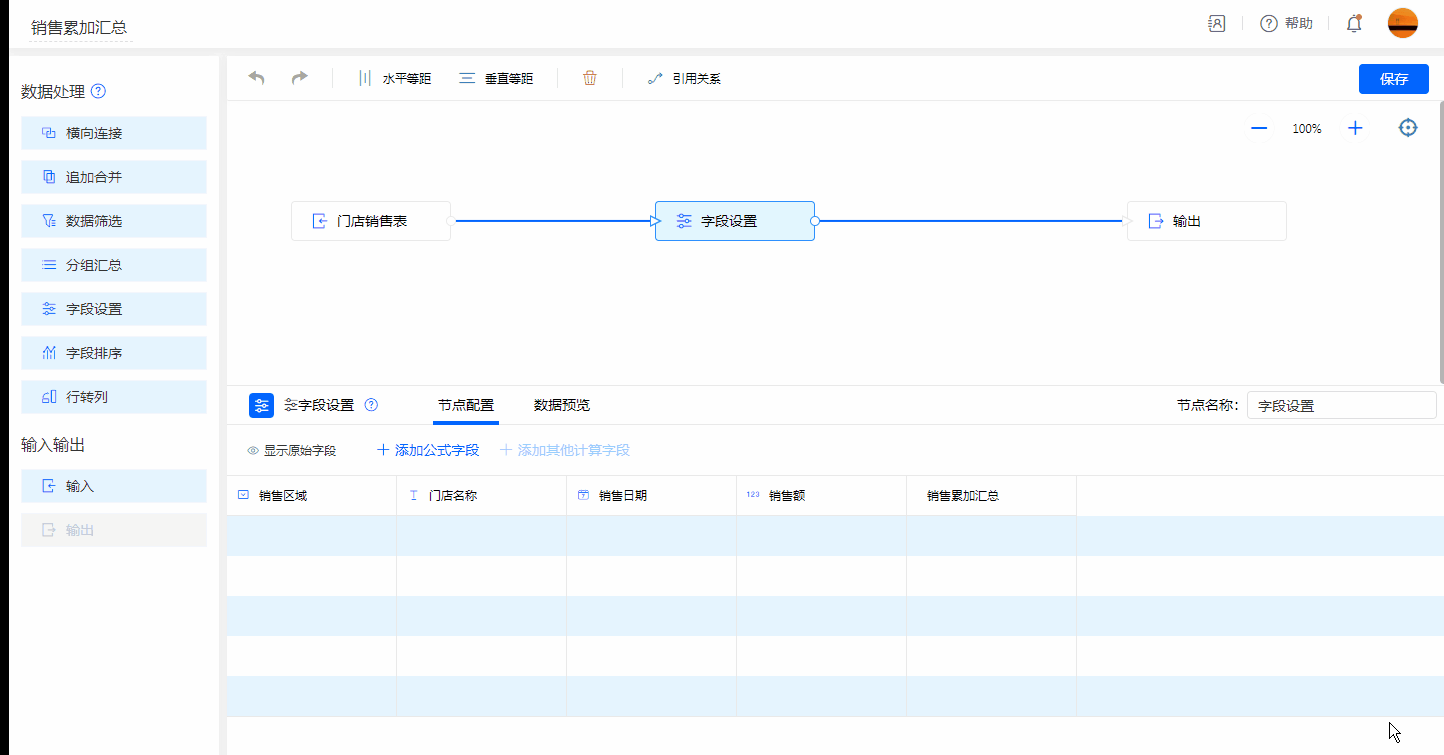 为数据流添加一个字段设置节点用于累加汇总计算: