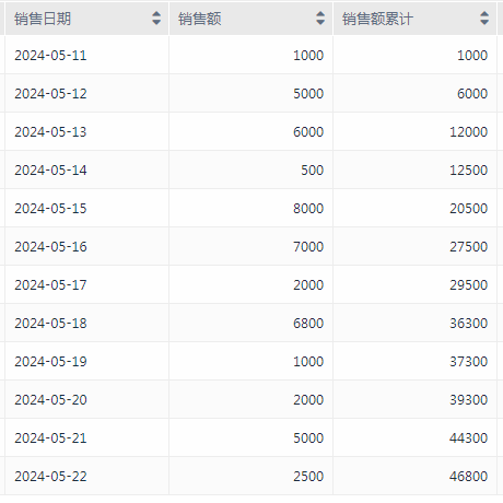 在无分组的情况下,将数据按照设置的顺序全量累加汇总。如,根据销售时间,对销售额累加汇总,及时了解各个时间段的销售总额: