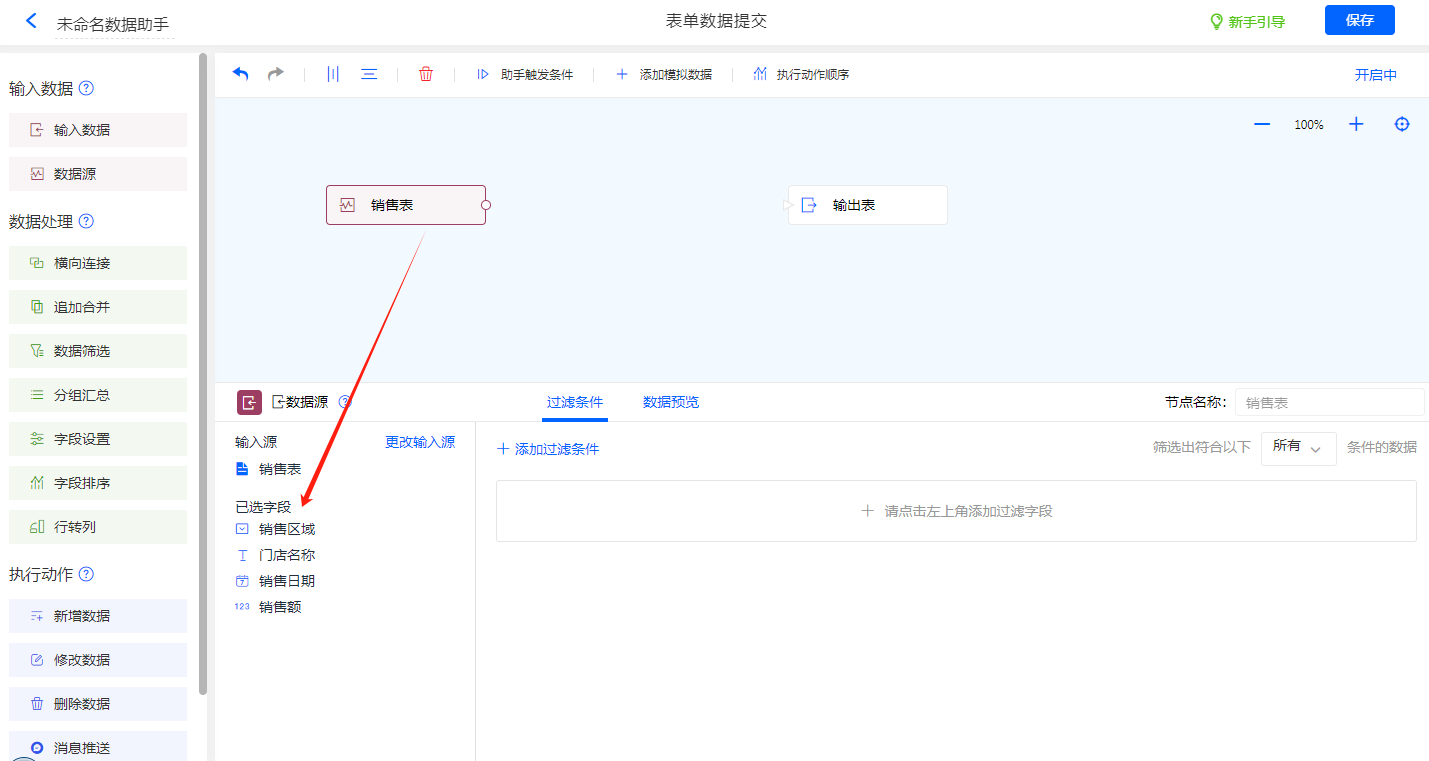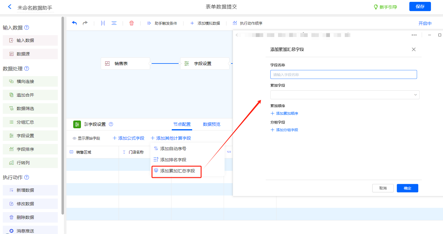 为数据流添加一个字段设置节点用于累加汇总计算: