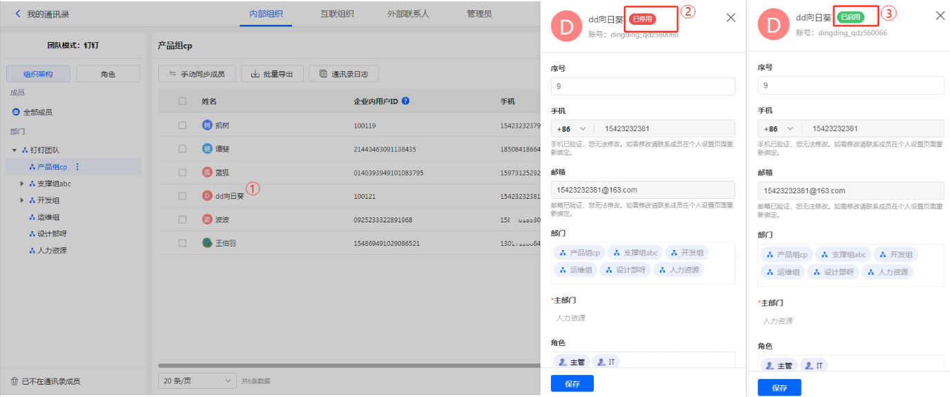 4)管理员(创建者、系统管理员、有通讯录可见可管理权限的普通管理员)无法将自己停用。普通管理员和普通成员可被他人停用。