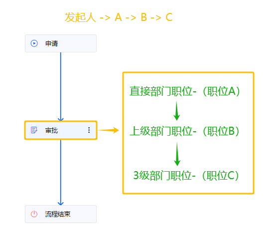 如在「审批」节点设置逐级审批为「发起人的 3 级部门职位」,则发起人提交后,在「审批」节点分别流转至 A、B、C 进行流程审批: