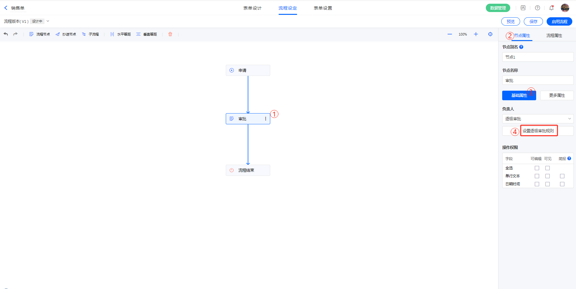 节点负责人设置为逐级审批后,各 节点属性 规则如下: