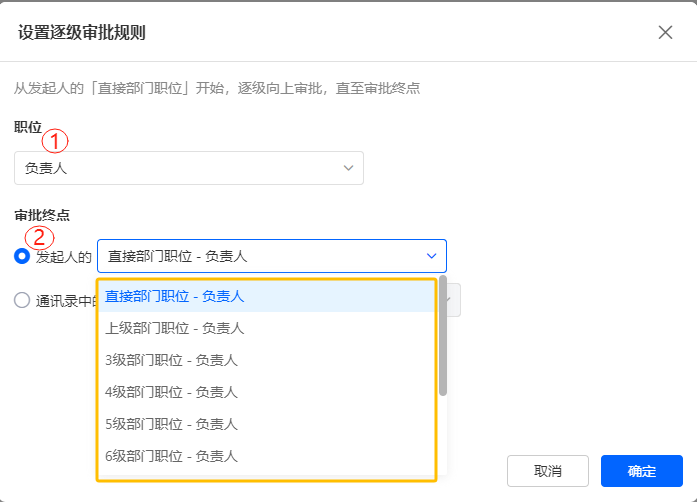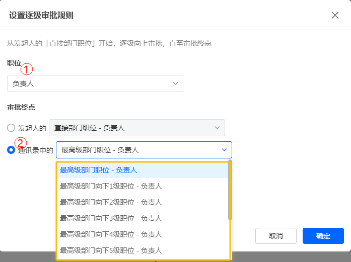 设置审批终点为通讯录中的某级部门职位,即从上向下计算职位层级,完成逐级审批。