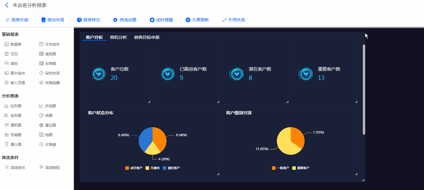 可直接拖动左侧[基础报表]、[分析图表]中的组件进布局容器内。如果有多个标签,将拖入选中的标签页中。