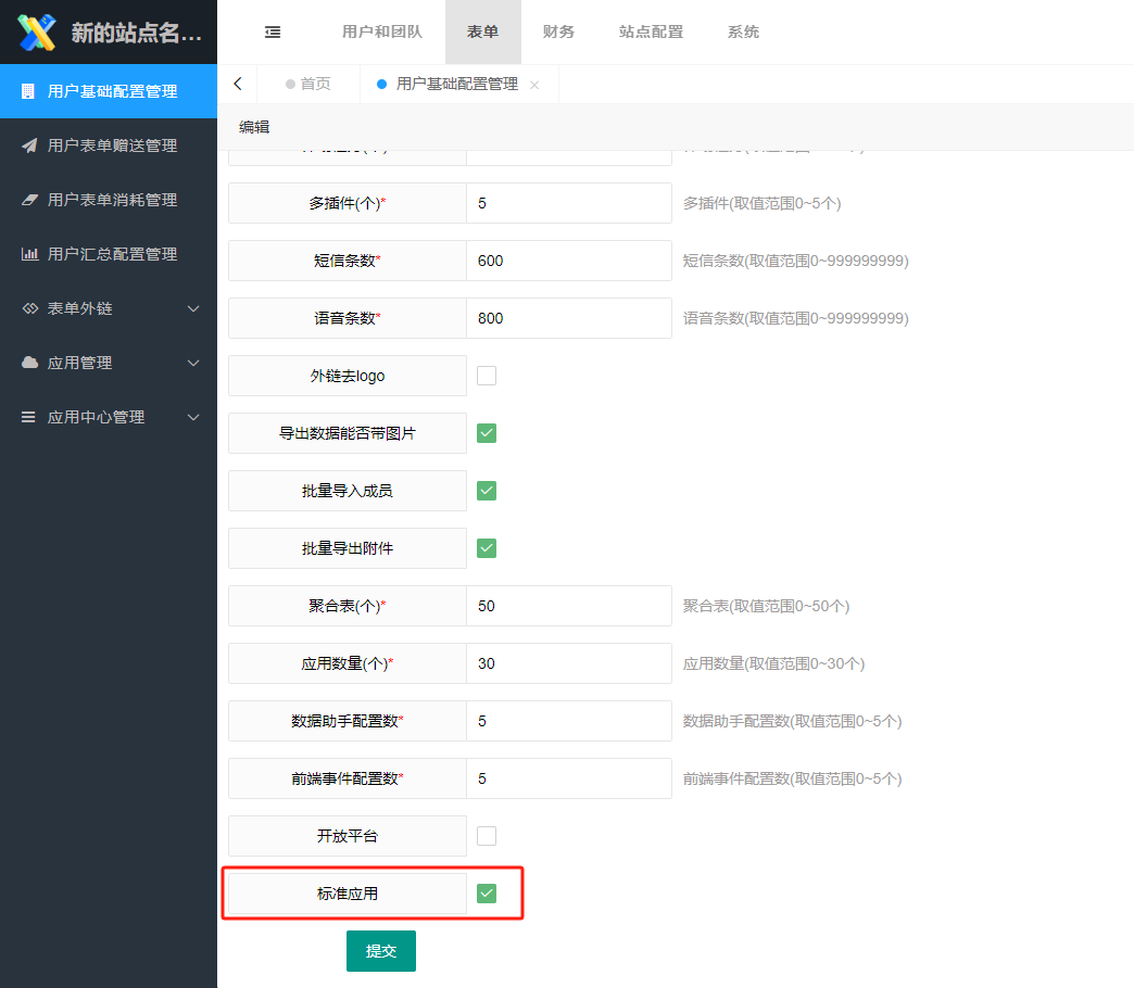 设置入口:管理后台>>表单>>用户基础配置管理,对需要使用「标准应用」的用户 勾选标准应用提交。如下图所示:
