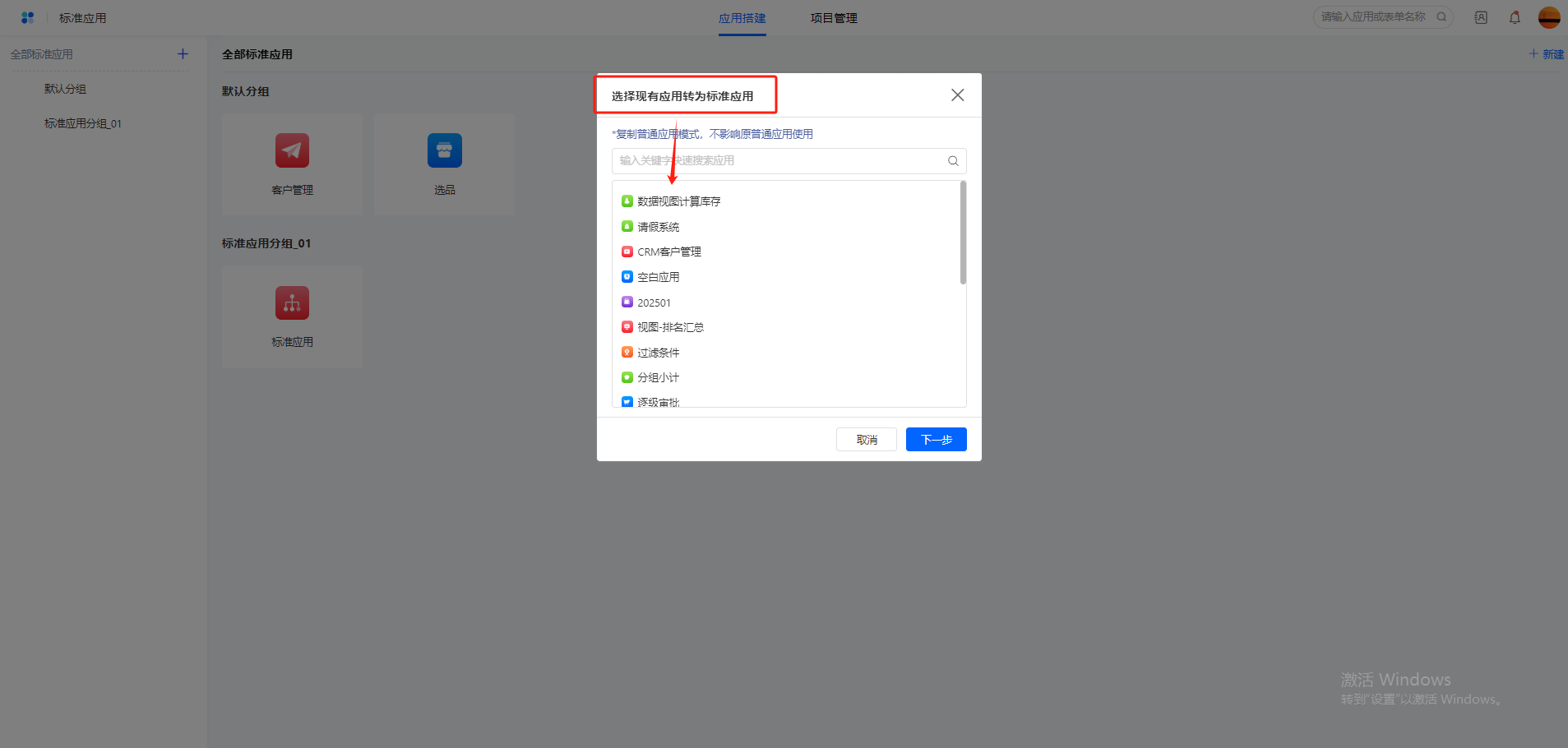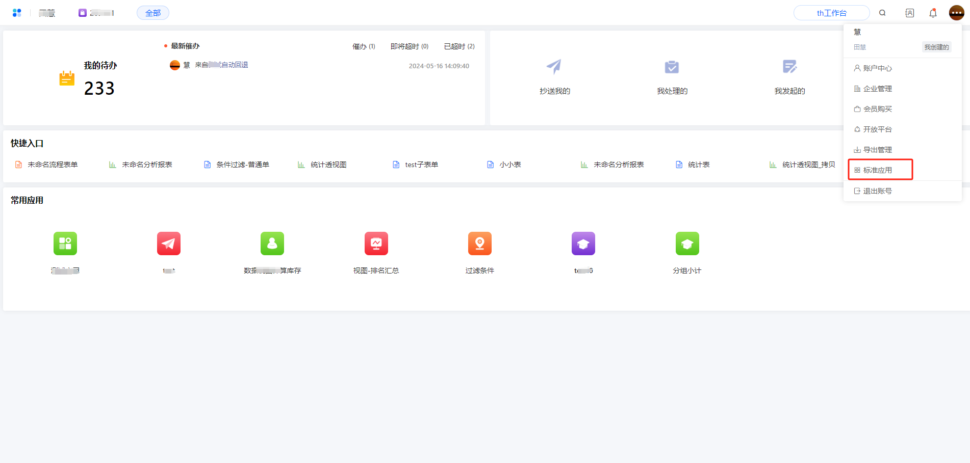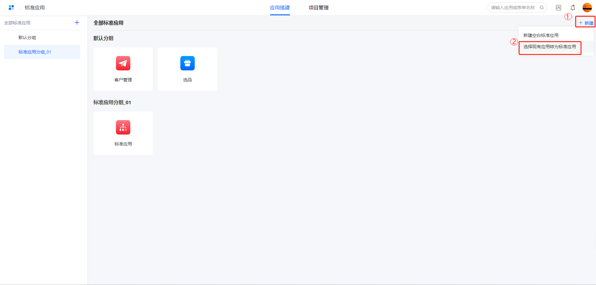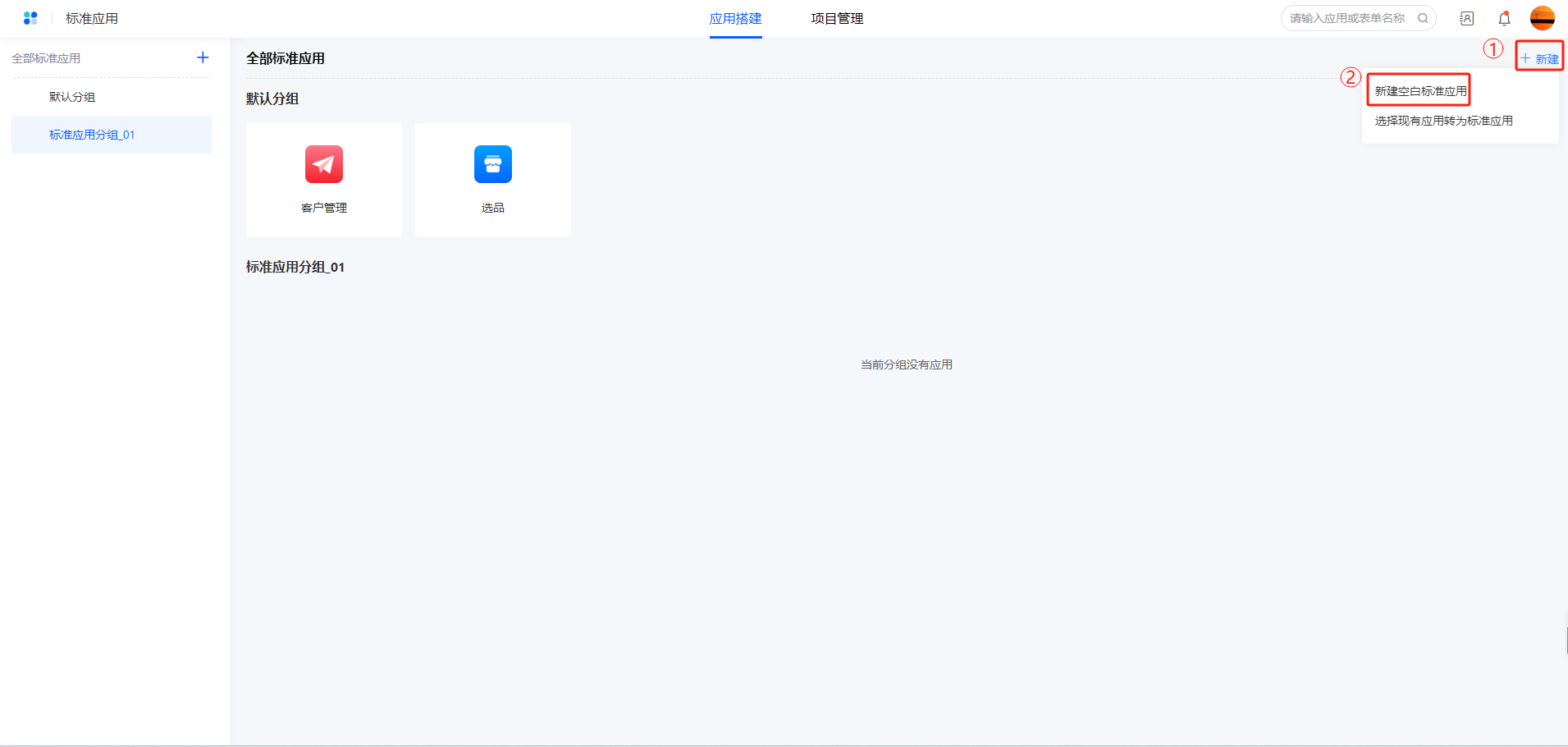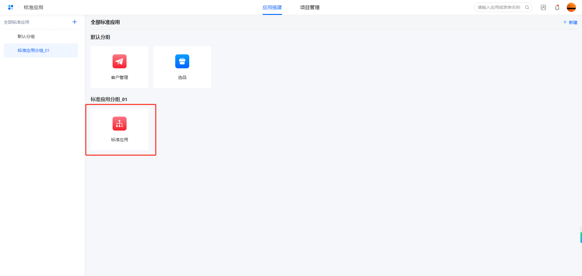 客户端入口:点击头像>>「标准应用」进入应用搭建页面。如下所示: