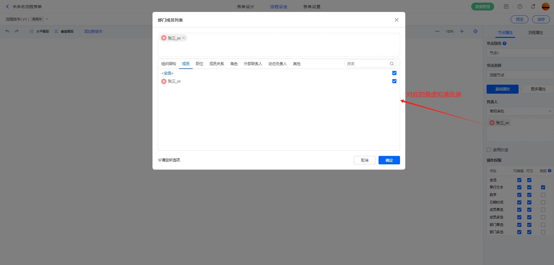 对表单流程节点 设置负责人,选择虚拟通讯录人员(例如:张三_xn)。如下图所示: