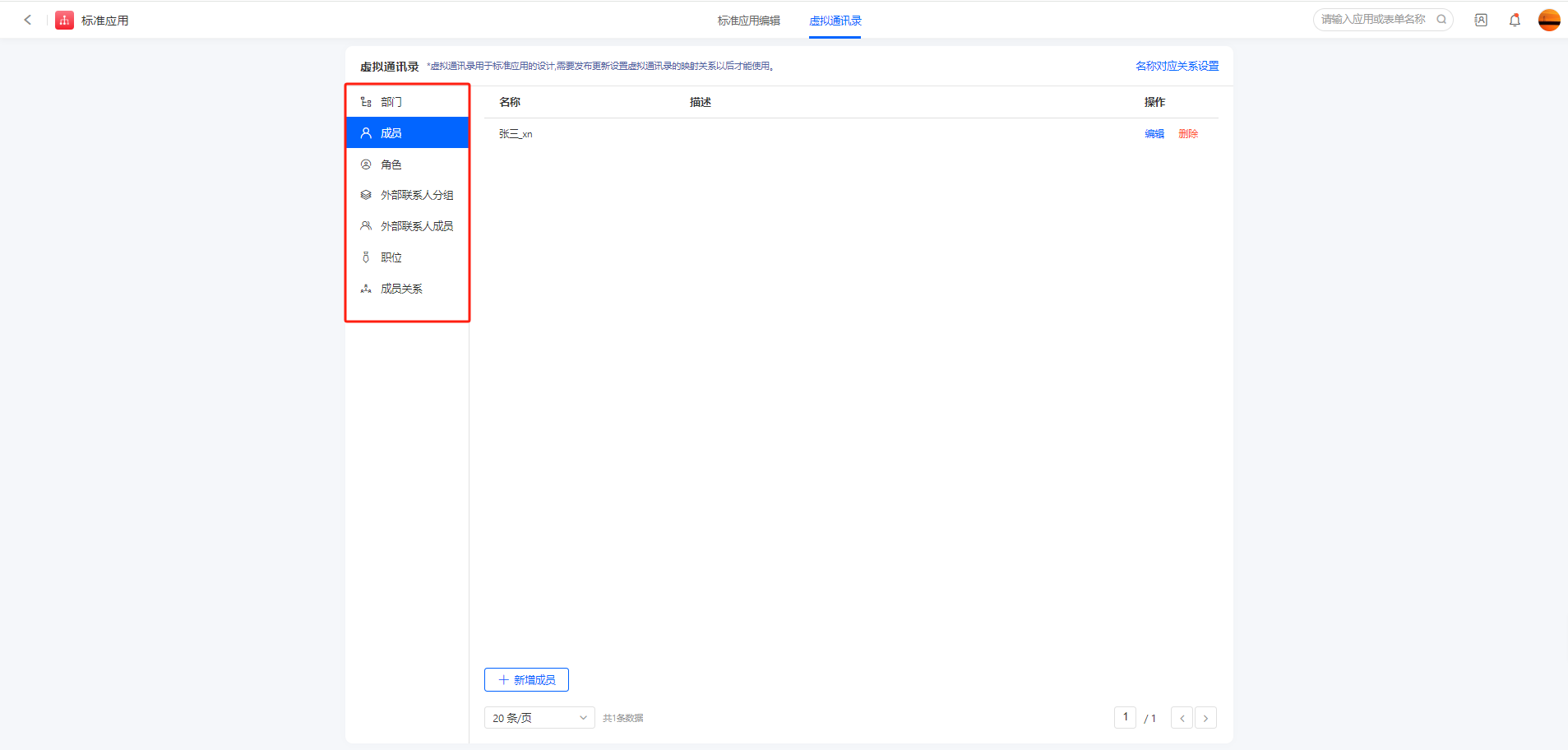 点击标准应用 进入标准应用编辑页面,点击「虚拟通讯录」进入,支持新增部门/成员/角色/外部联系人分组/外部联系人成员/职位/成员关系。如下图所示: