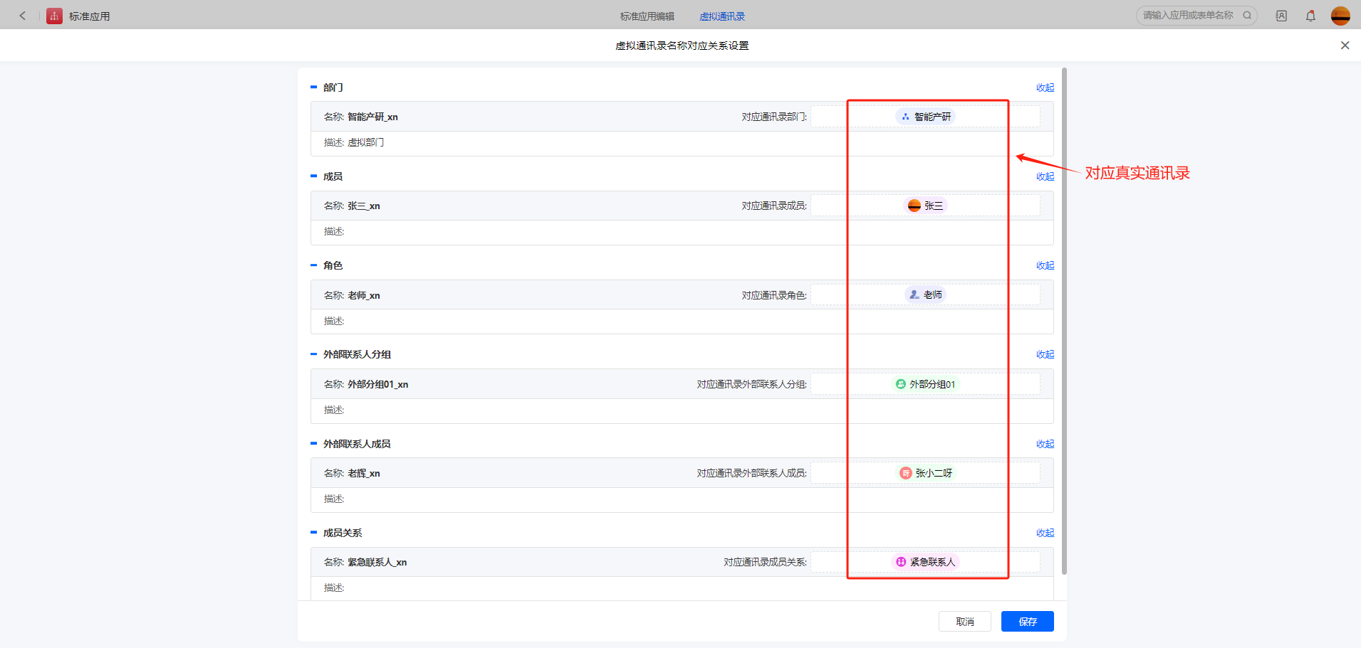 新增好虚拟通讯录,点击「名称对应关系设置」进入,设置真实对应通讯录的部门/成员/角色/外部联系人分组/外部联系人成员/职位/成员关系。如下图所示: