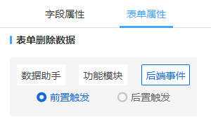 当表单删除数据时,在删除数据前或在删除数据后触发_formdelete事件。默认为"前置触发",详情请见后面的事件触发示意图 。