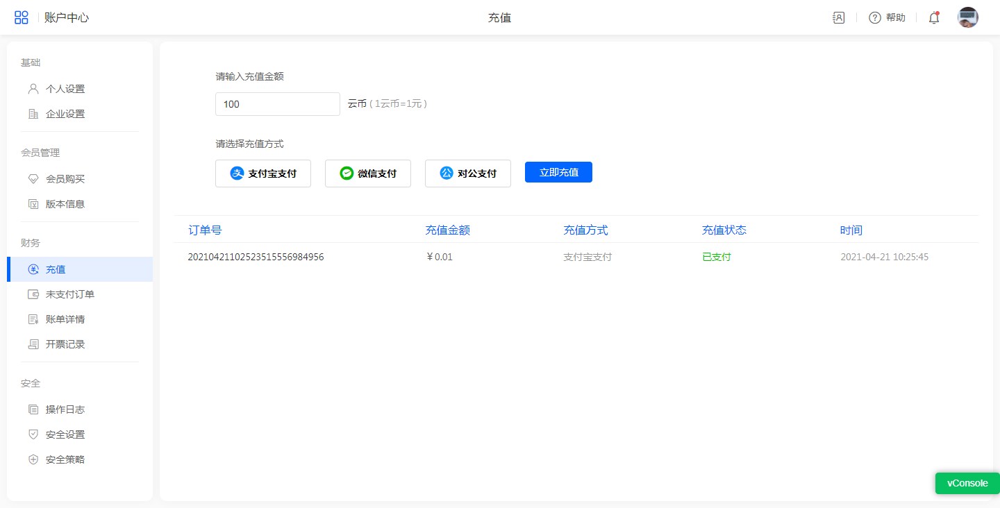 充值即进行账户余额充值,百数的消费均是云币,充值的方式支持支付宝、微信、对公支付这三种。