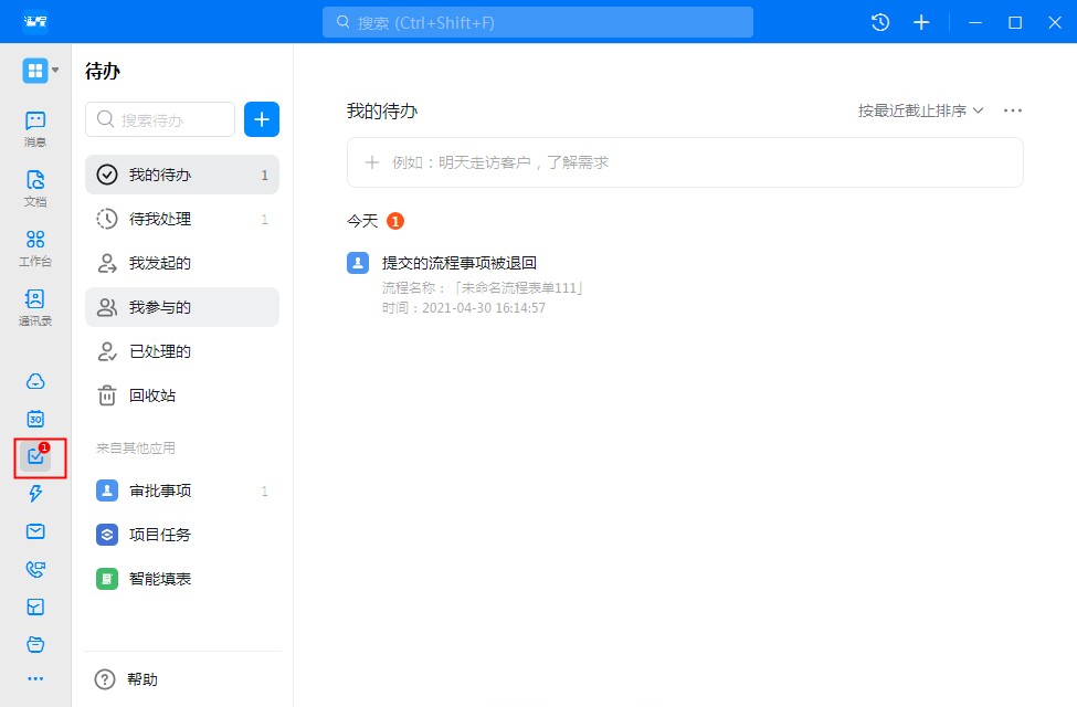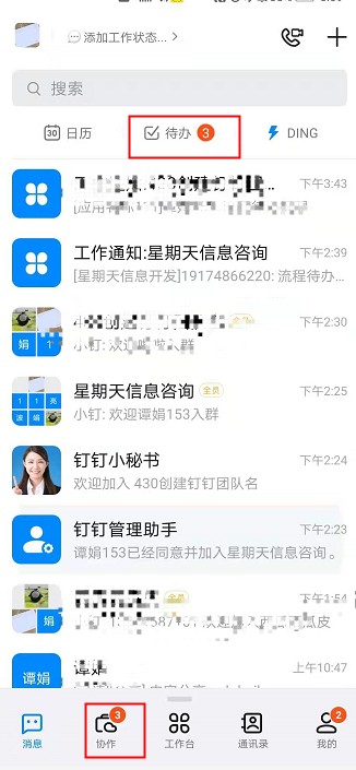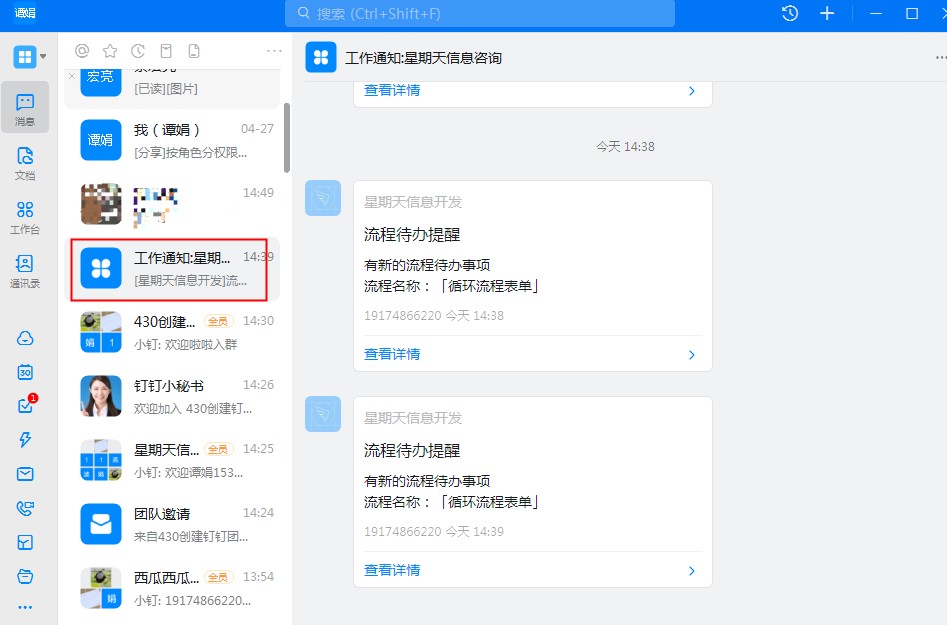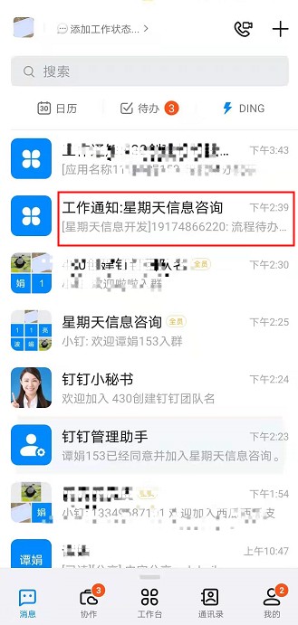 • 在消息列表-工作通知中,收到推送消息,点击消息可以进行处理。