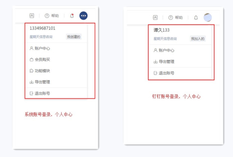百数账号和钉钉扫码登录系统,在个人中心的功能不一致。