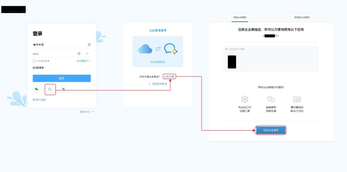 操作步骤:【打开官网】——【点击企业微信登录】——【点击点此立即开通】——【点击注册企业微信】——【在企业微信注册页面完成账号注册】