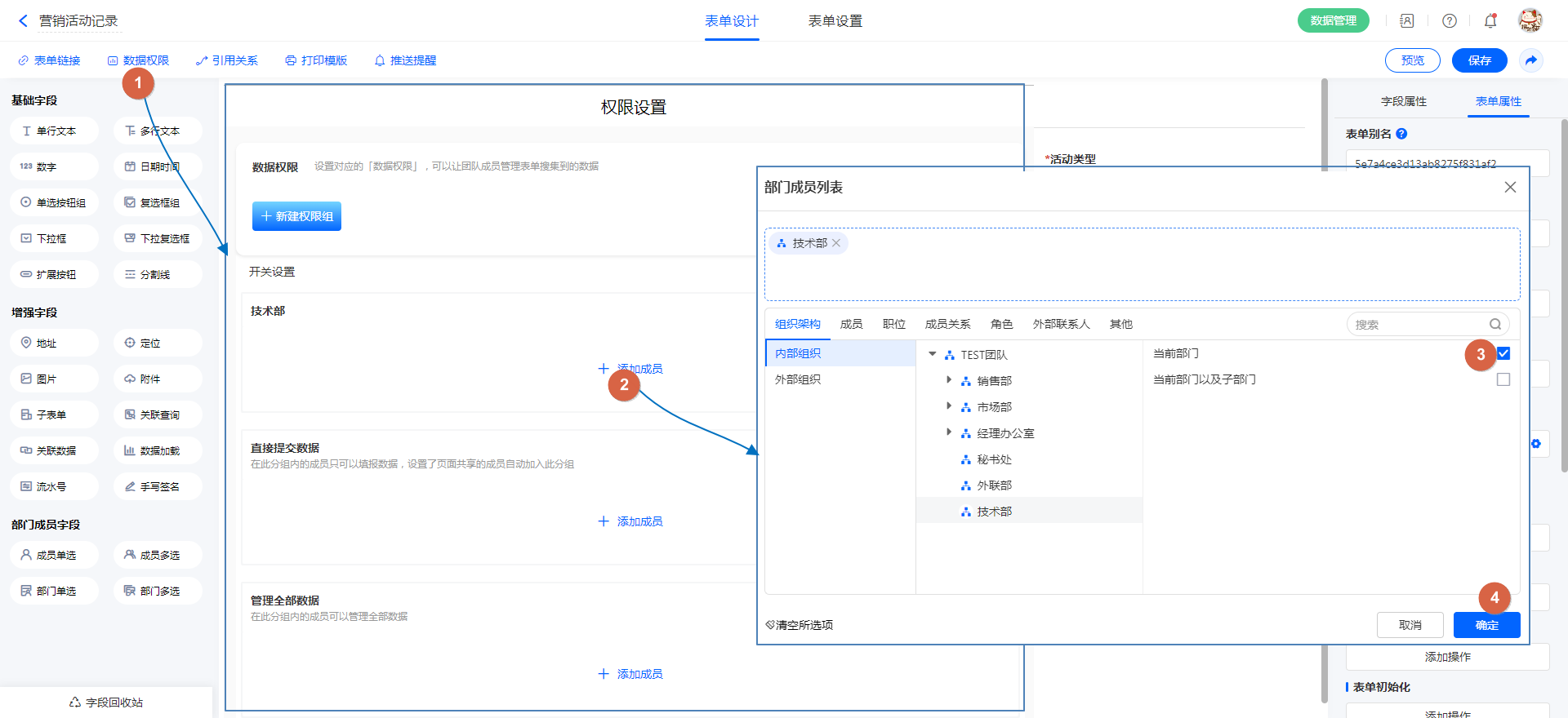当成员已经被邀请进入通讯录后,除了对其部门和角色进行设置之外,在应用中,也需要给对应的部门/角色/成员一定的权限,包括数据的提交权限、流程的查看权限、报表的查看权限等,才能更加方便成员间互相协作。