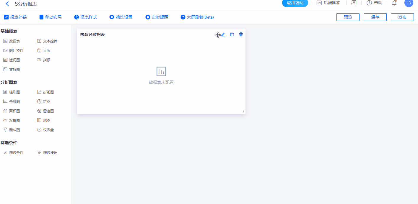 首先创建分析报表,修改名称后拖入数据表并设置大小。