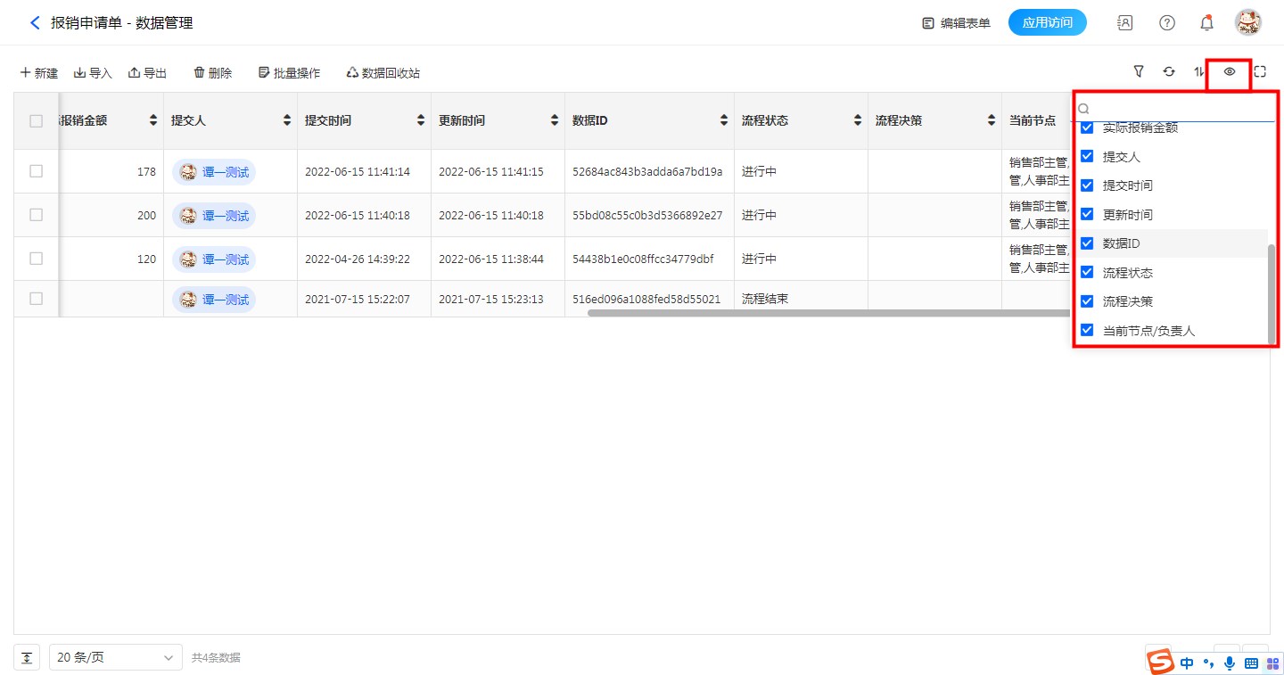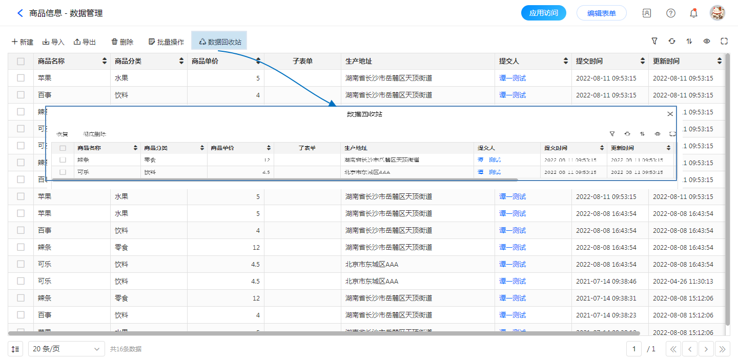 当被分享的表单被填写数据后,可以通过数据管理页面来进行管理。