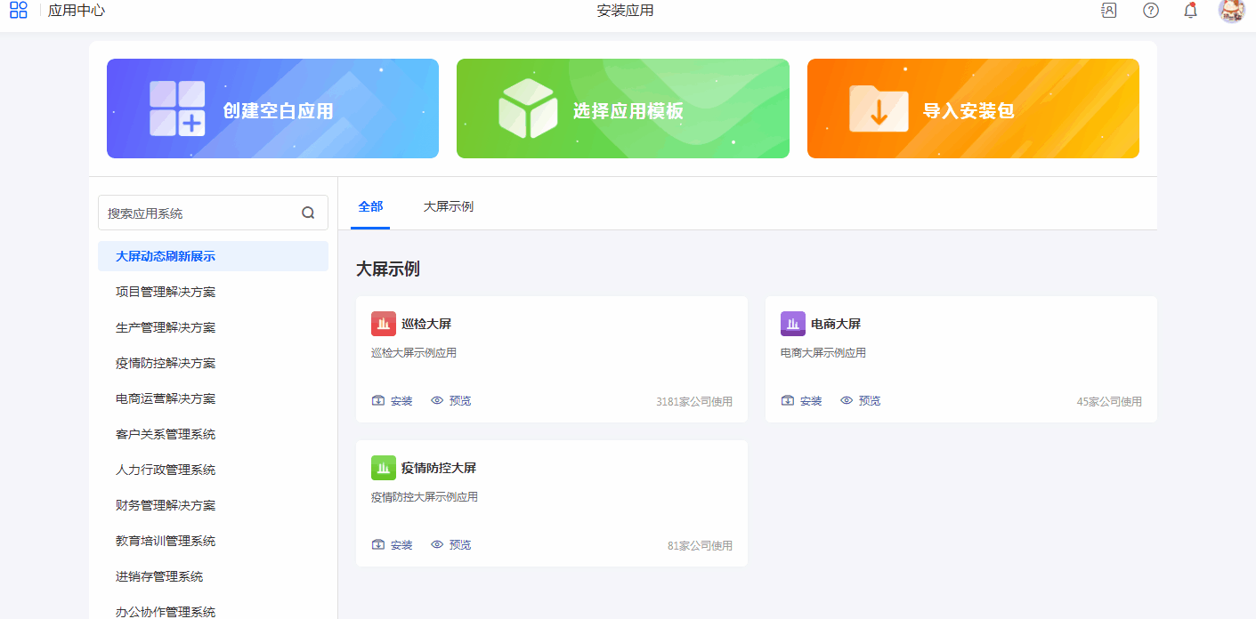 2. 选择应用模板,安装应用中心应用,直接使用。 为了减轻用户自己设计应用的难度,我们还提供了各行各业的模板应用供参考。