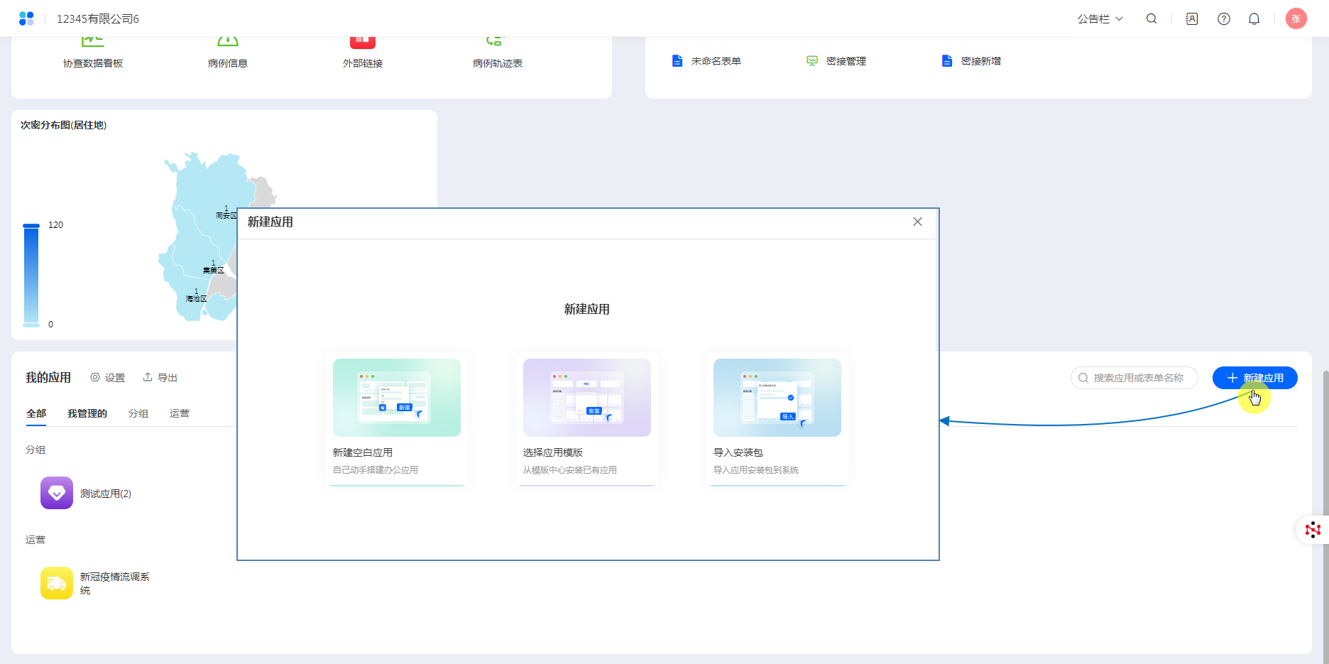 工作台入口:【登录系统】——【工作台】,在我的应用下,如果需要创建新应用,可以点击【新建应用】。