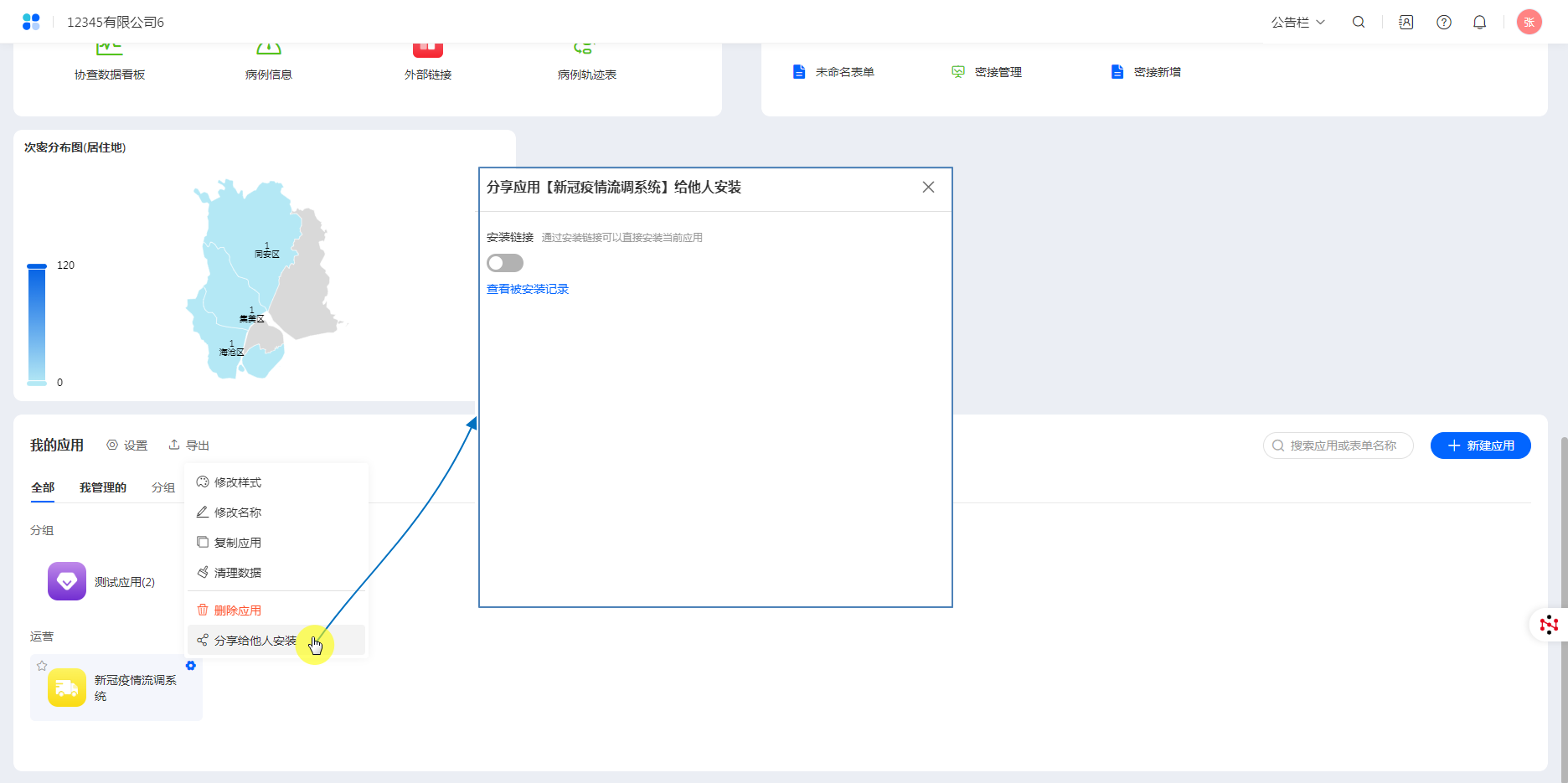 操作步骤:【工作台】——【我的应用】——【鼠标悬浮在目标应用上,点击[设置]按钮】——【点击[分享给他人安装]】