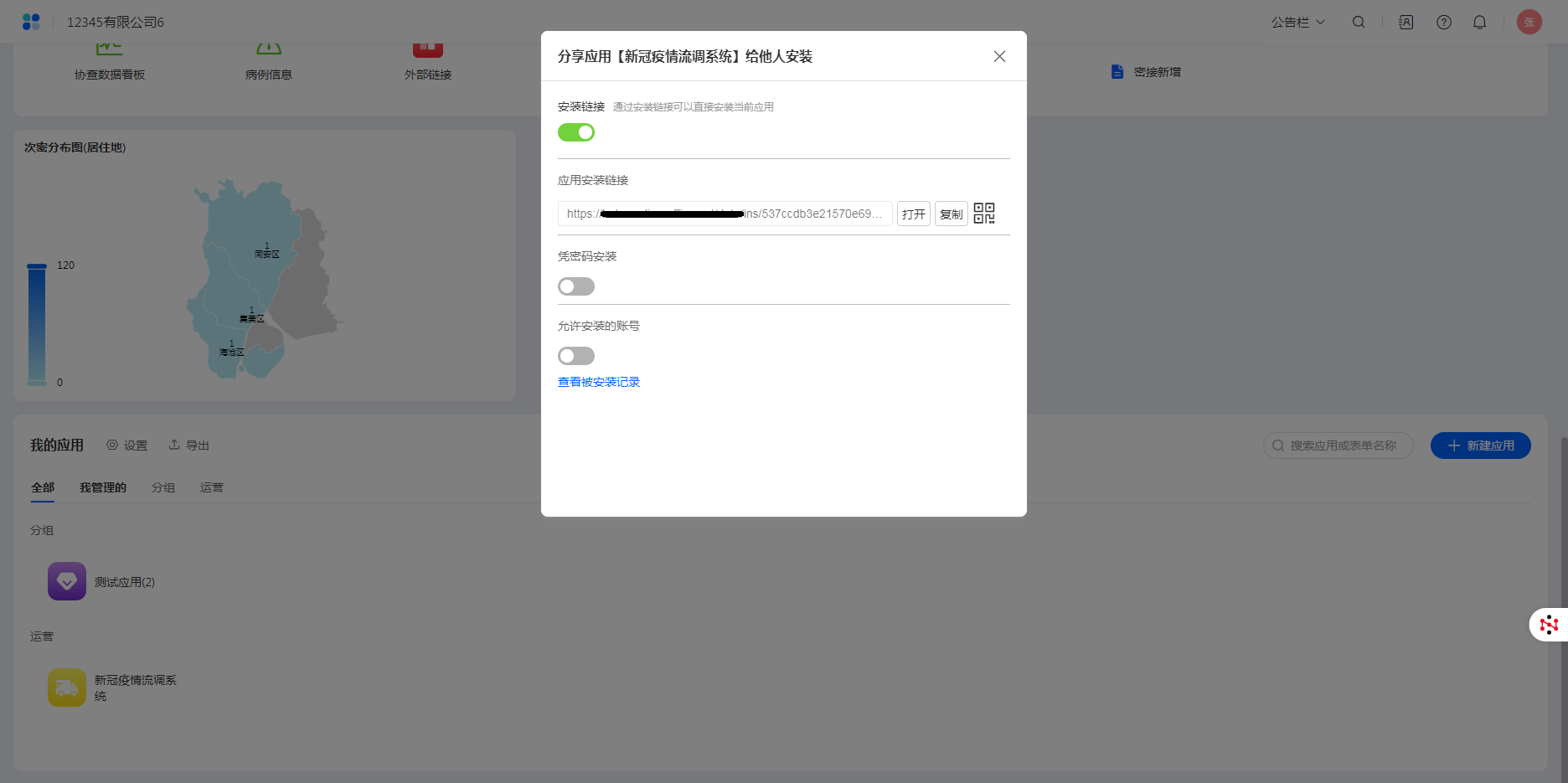分享给他人安装即可以自由选择自己账号下的应用给其他人安装,只需开启安装链接,别人就可以通过链接或二维码扫码安装应用。