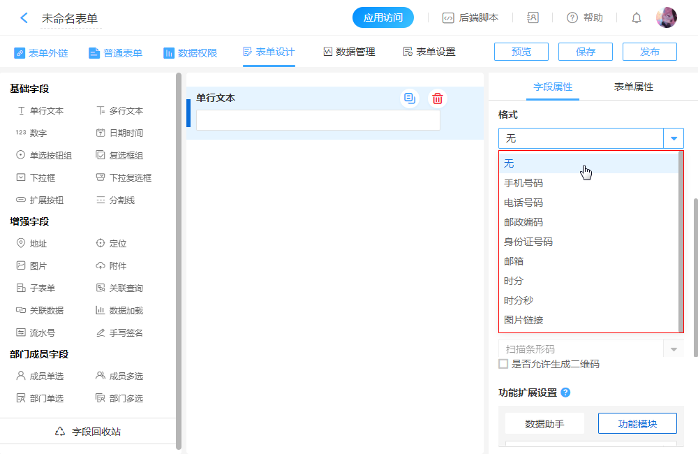 在“单行文本”控件中,系统预设的数据格式,起到控件校验的作用。