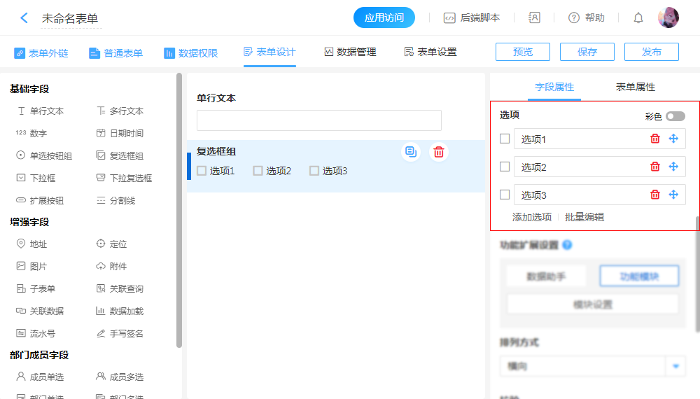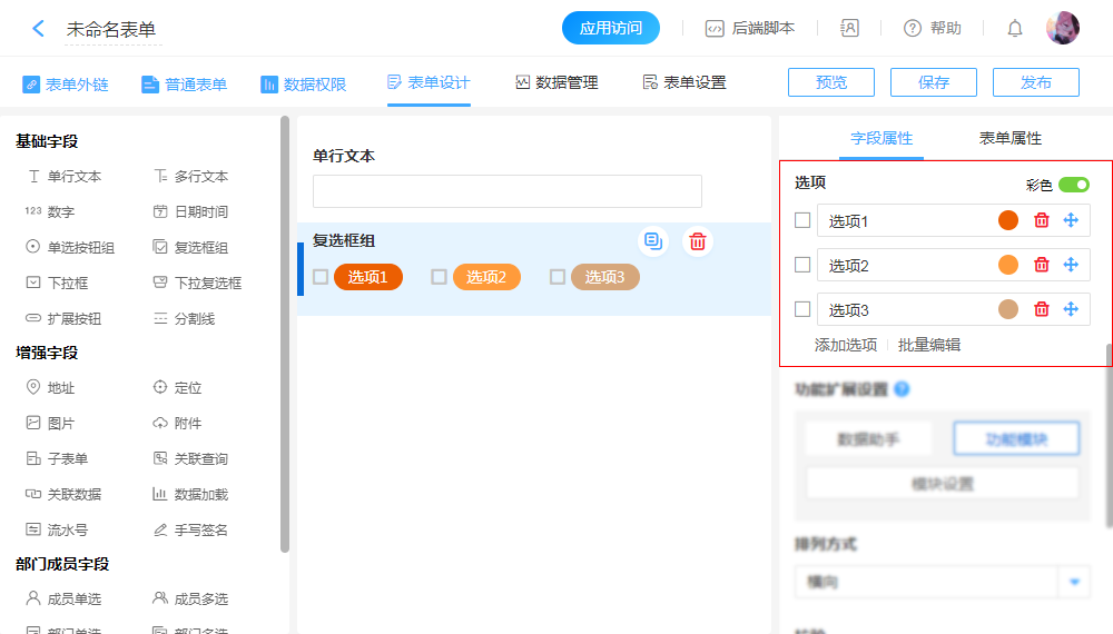 选项排序 选项右侧有排序按钮,点击上下拖动选项即可排序。