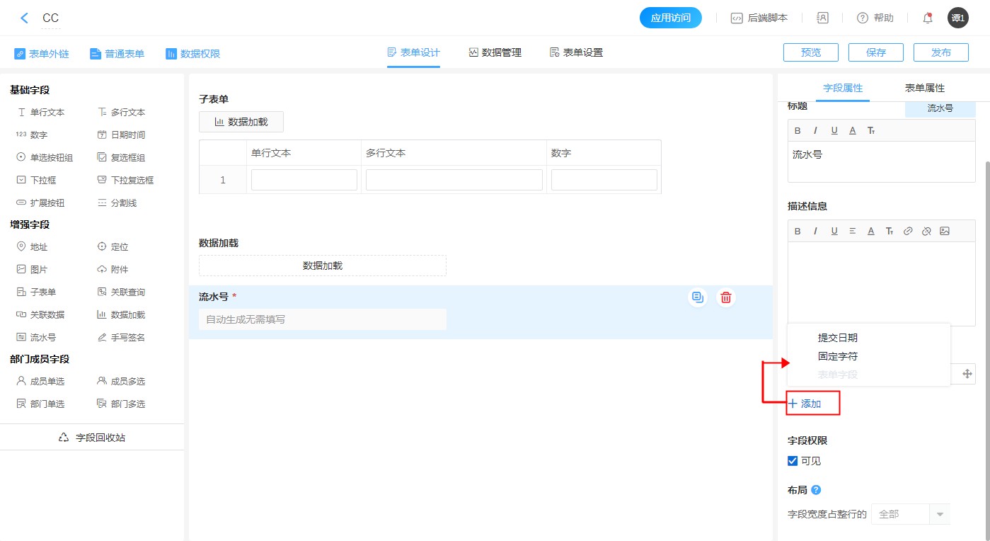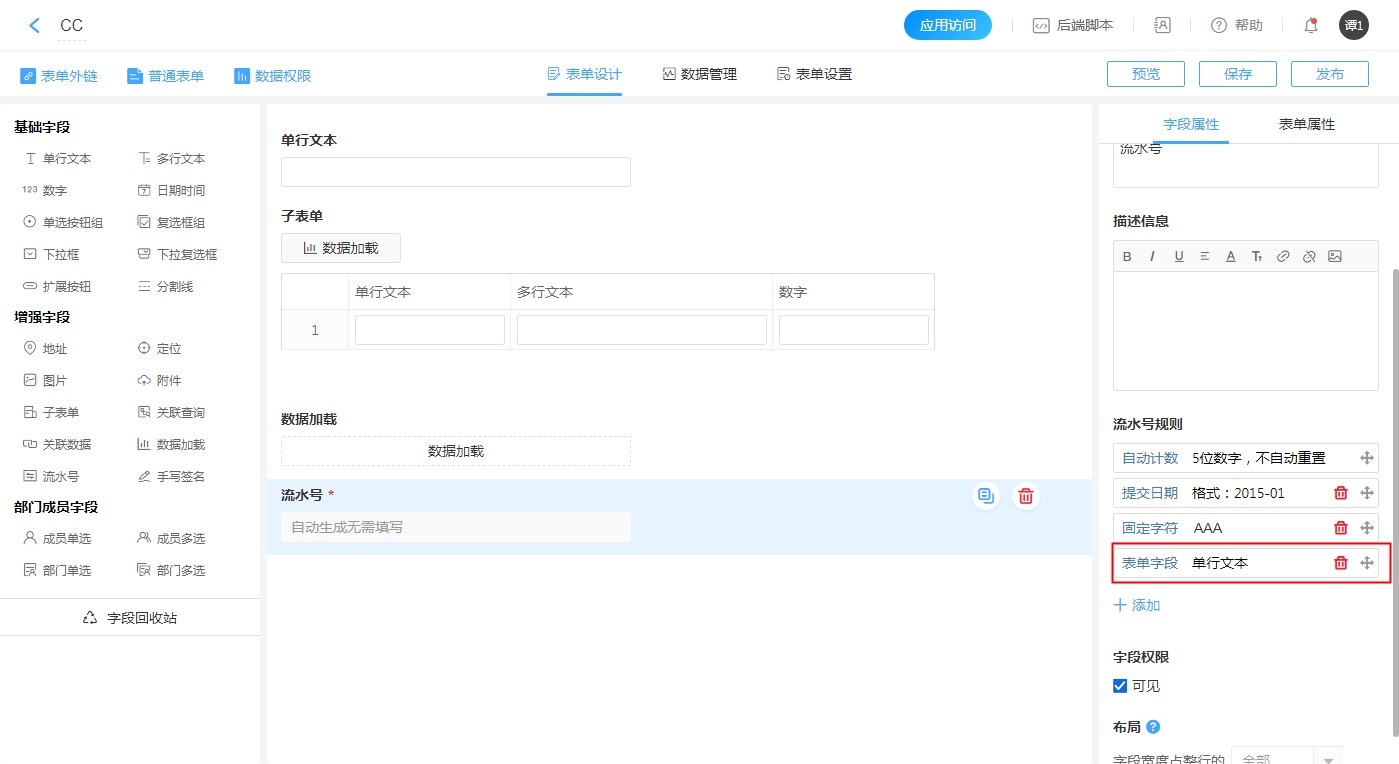 表单设计中经常涉及编号制作的问题,该控件为“流水号”字段,通过该字段即可轻松实现编号的自动生成。