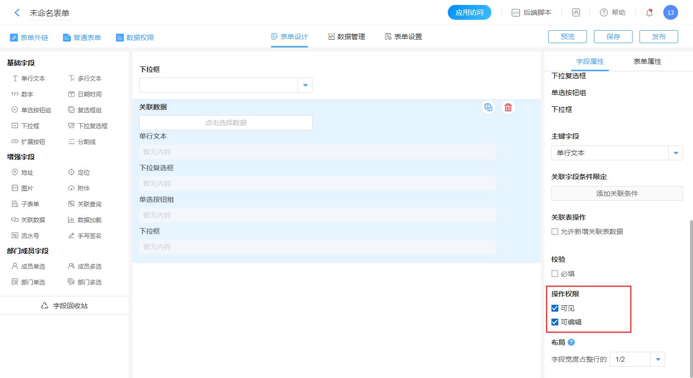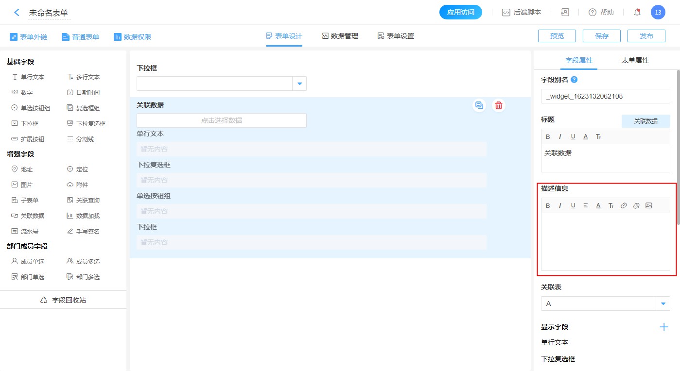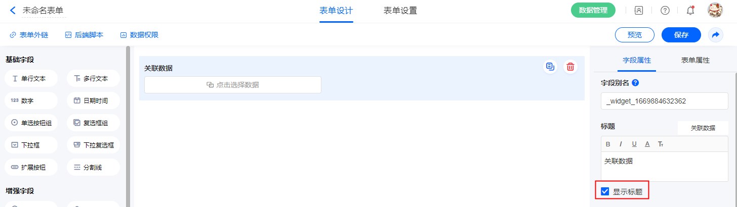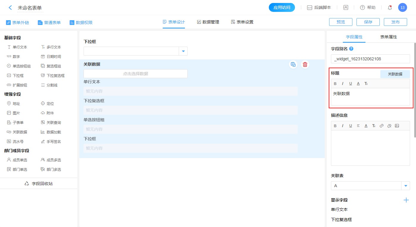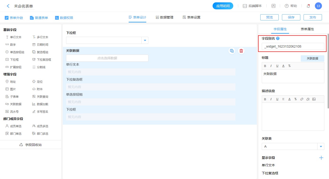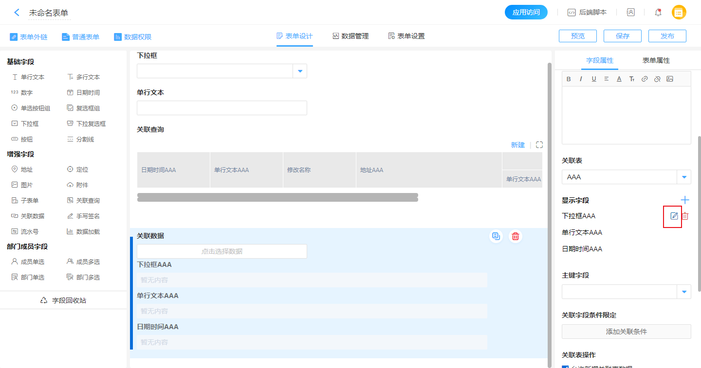 编辑关联字段:点击关联字段的编辑按钮,可以修改字段的显示名称,此名称仅在当前表单展示时生效。
