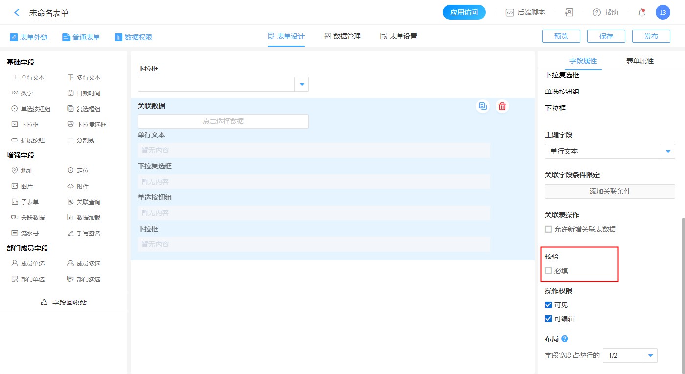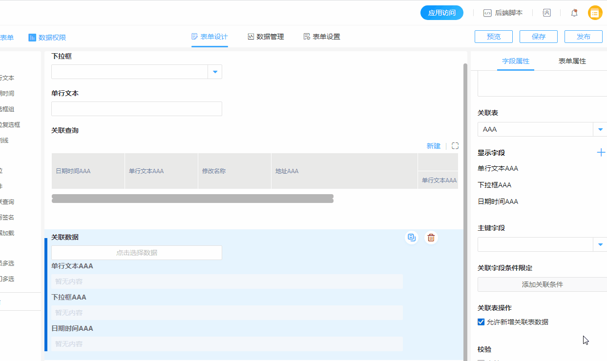 勾选【允许新增关联表数据】后,可在当前表单操作时可以新建关联表数据。