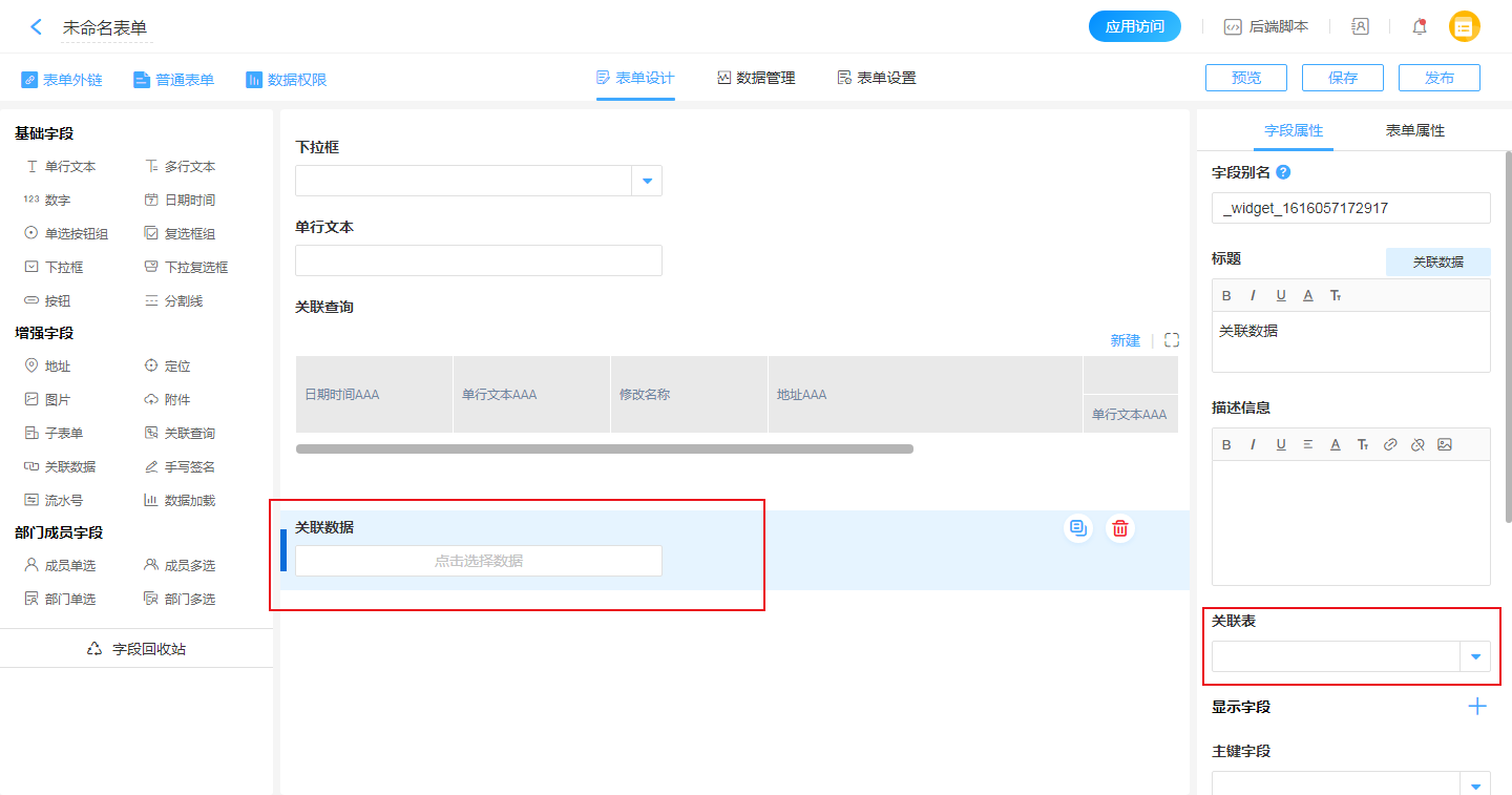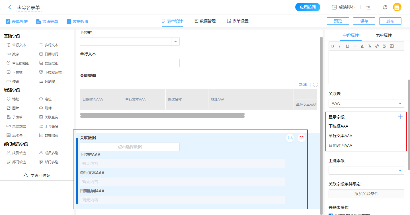 关联表指获取数据的来源表,通过下拉列表来指定要关联的表单。