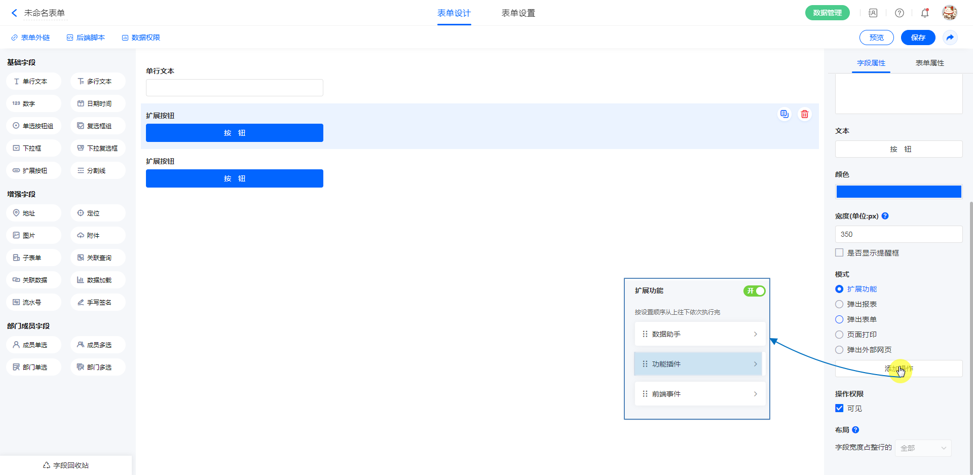 功能插件是扩展按钮基本功能之一,设置扩展按钮的属性为功能插件,并对引用的插件进行设置,在点击扩展按钮后,会按顺序执行所设定的功能插件,为表单的扩展性提供无限支持。