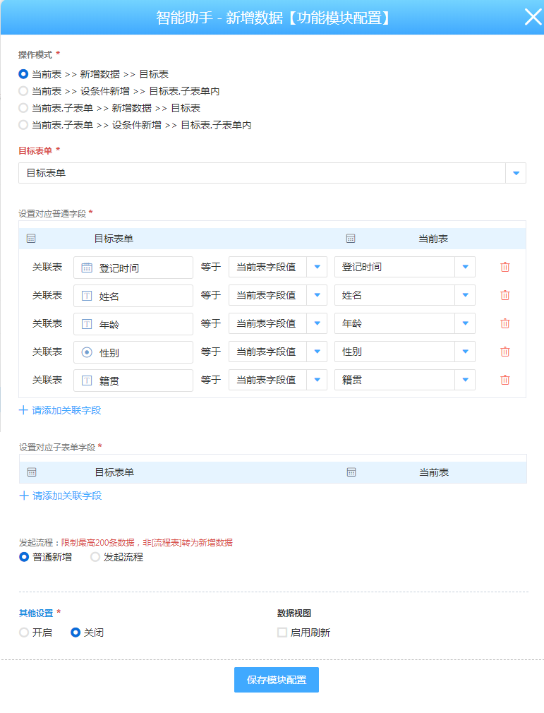 • 例如:当前表单填写内容,通过按钮向其他表单新增数据,插件配置如下: