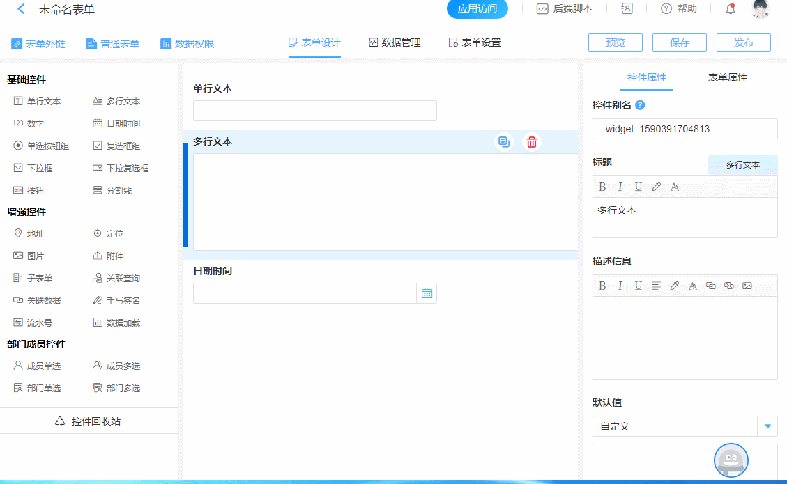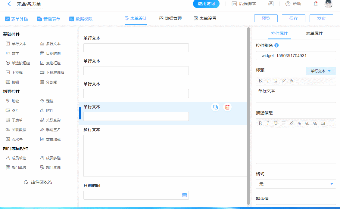 即用户在访问表单时,对该控件的操作权限。部分控件可设置是否可见、是否可编辑。