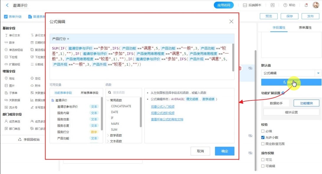 1、邀请评价表单,当参加评价时,会显示【服务内容】、【服务效率】、【服务态度】、【产品功能】、【产品使用难易程度】、【产品外观】字段。 无论参不参与评价,【服务打分】、【产品打分】、【总评分】字段始终隐藏,不给提交人员展示。