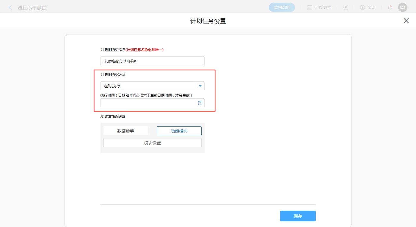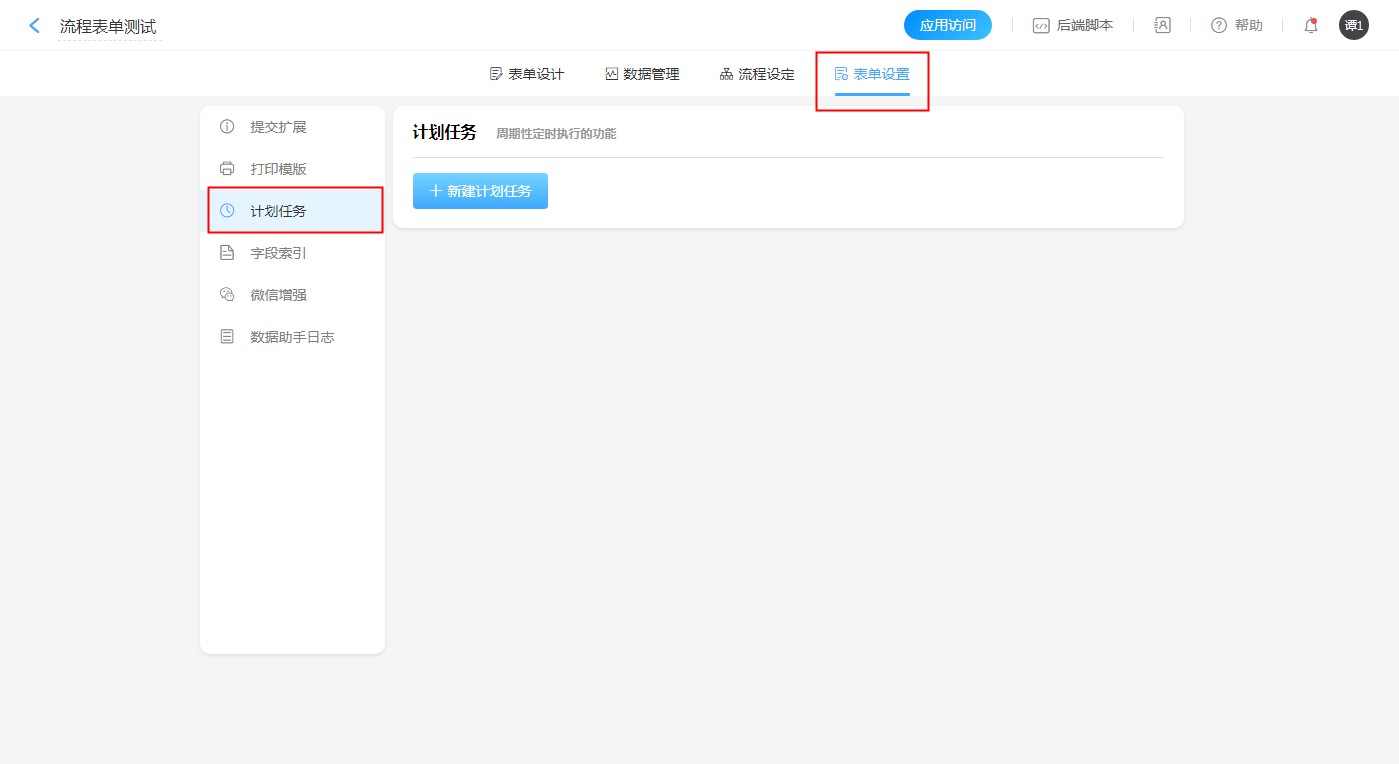 步骤:【应用编辑页面选择目标表单】——【表单设置】——【计划任务】——【新建计划任务】