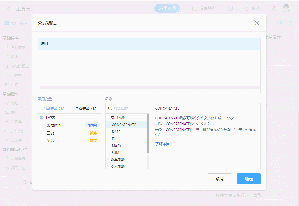 • 注意: 所有的控件,都有一个内置的ID,而所能看见的控件名称,也仅仅是一个名称,所以当公式需要将控件值作为变量的时候,手动输入或复制粘贴都是无效的,因为字段名可以重复。如果需要将这个字段(控件)引入计算,需要手动点击左侧的字段列表。