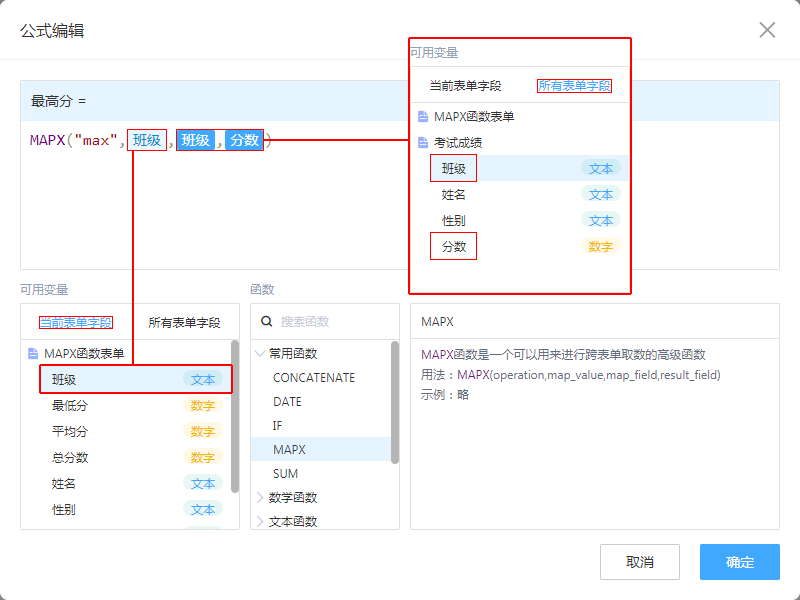 MAPX("max","一班",目标表单班级,目标表单分数)