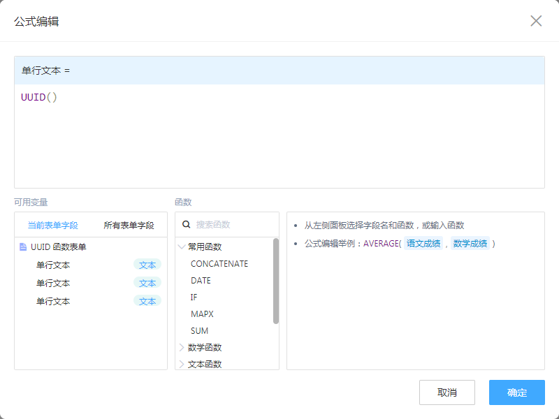 注意 UUID() 可以保证输出的32位字符串不会重复,但不能保证从这32位字符串中截取的一部分也不重复,因此有需要不重复的用户,需要勾起“单行文本”属性中“不允许重复值”。