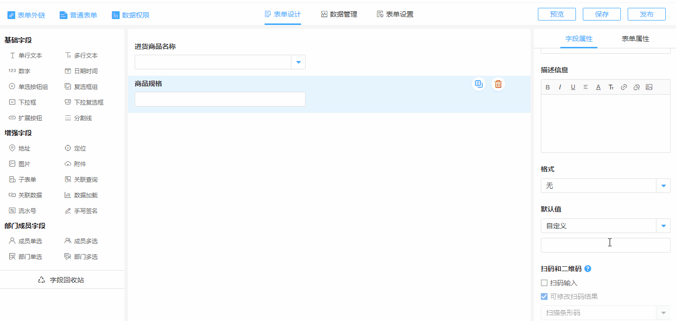 联动字段创建: 【创建[单行文本](标题:商品规格)】——【控件属性】——【默认值】——【数据联动】——【数据联动设置】