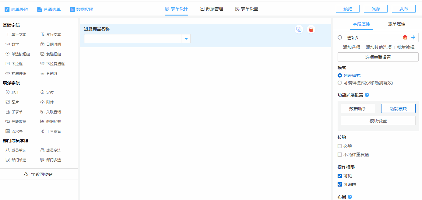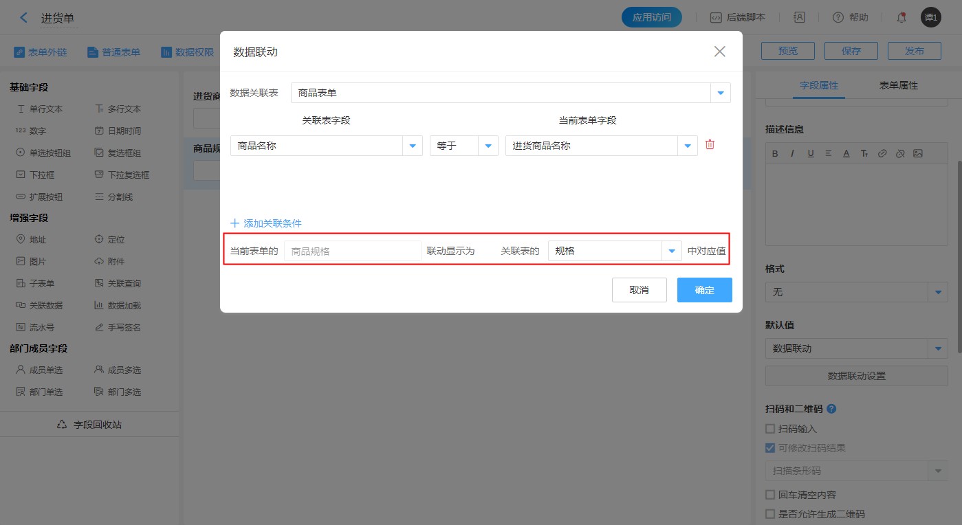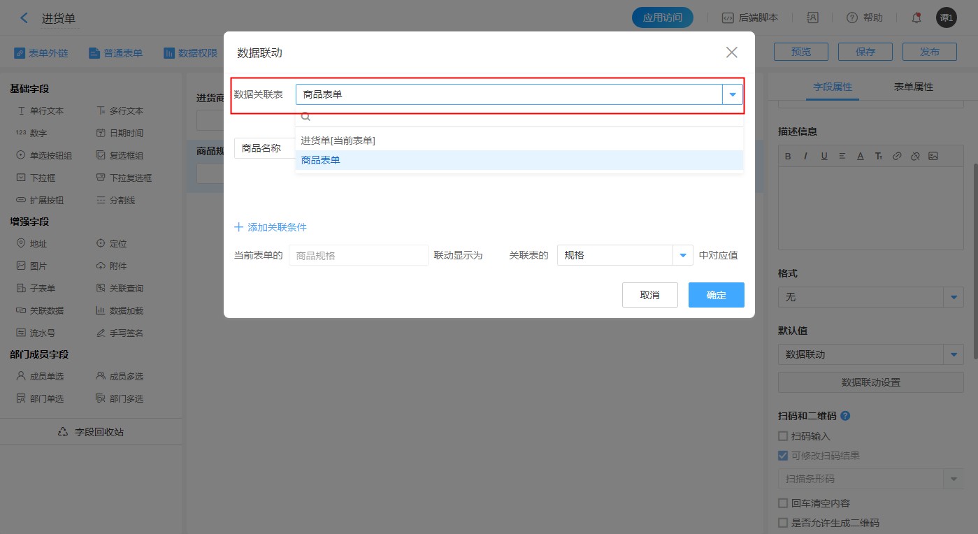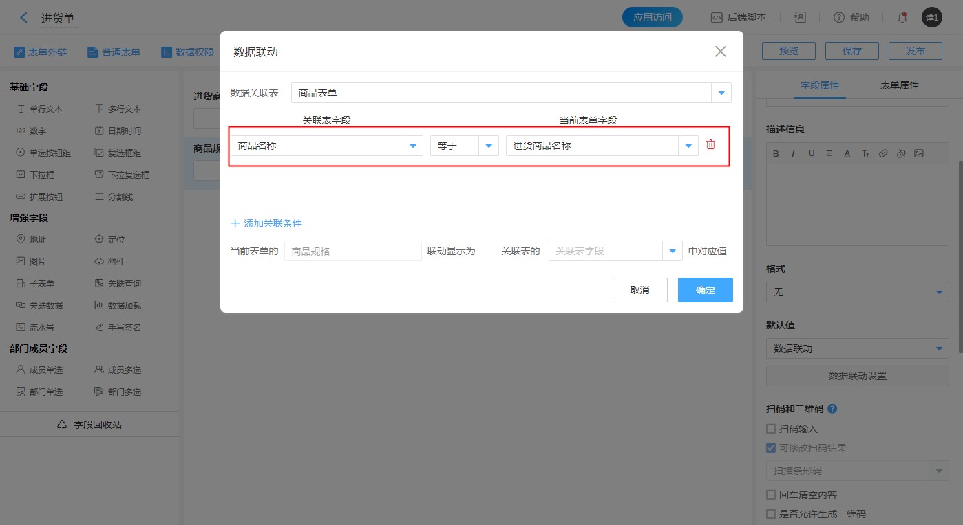 联动条件字段创建: 【创建【下拉框(标题:进货商品名称)】——【选项】——【关联其他表单】——【商品表单—商品名称】