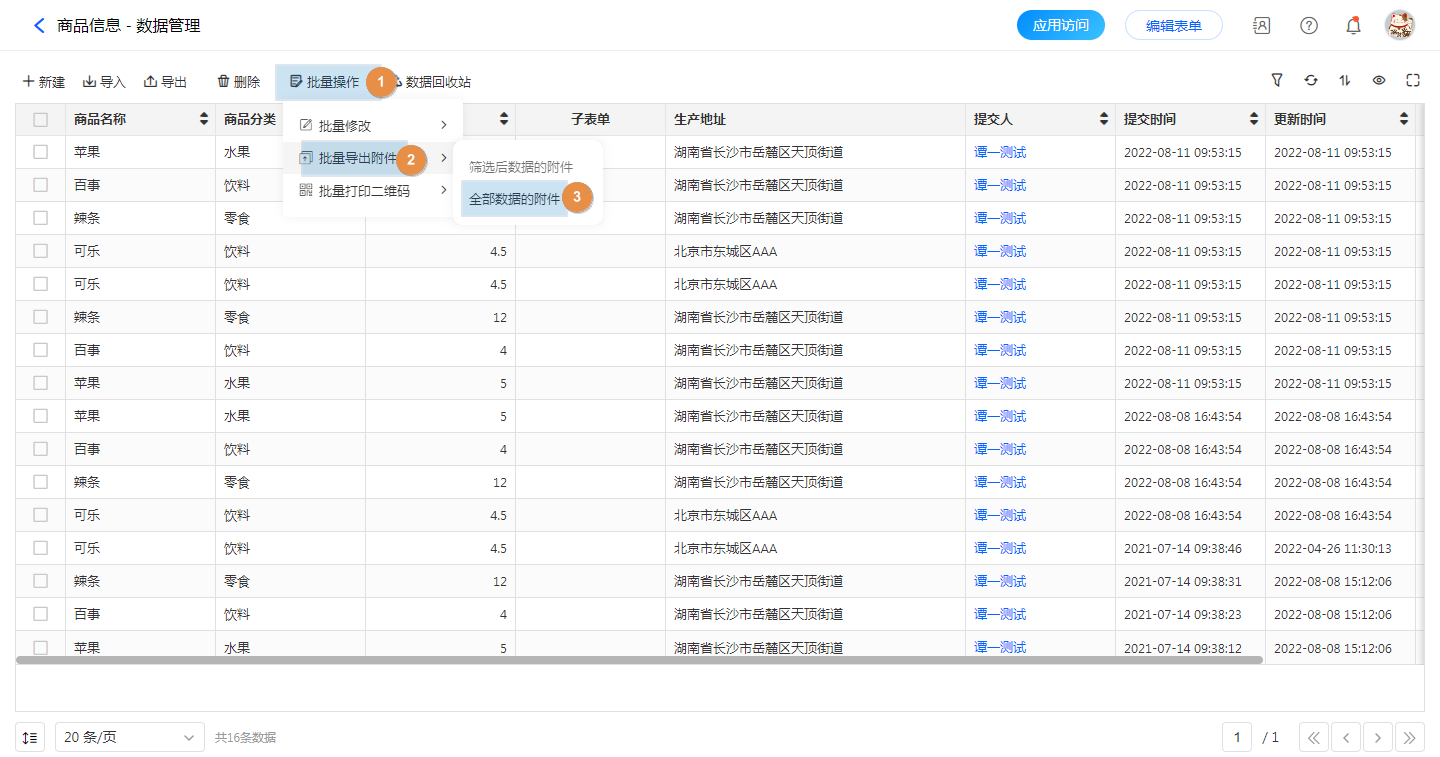 如先筛选出商品种类为糕点的数据 > 再点击导出附件 > 选中导出过滤后的数据中的附件 > 则最终只导出商品种类为糕点的数据的附件,其他数据的附加不导出。