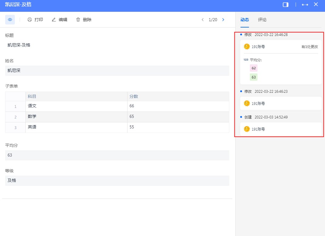 填写表单时,一旦误改了表单中的数据,想要改正时就如大海捞针。同时,当团队合作填写表单时,同事改动了某一个数据,我们却没办法收到提醒。此次更新的【动态】功能能够实时记录所有删改动态,在【评论】区中,同事间能进行沟通交流。